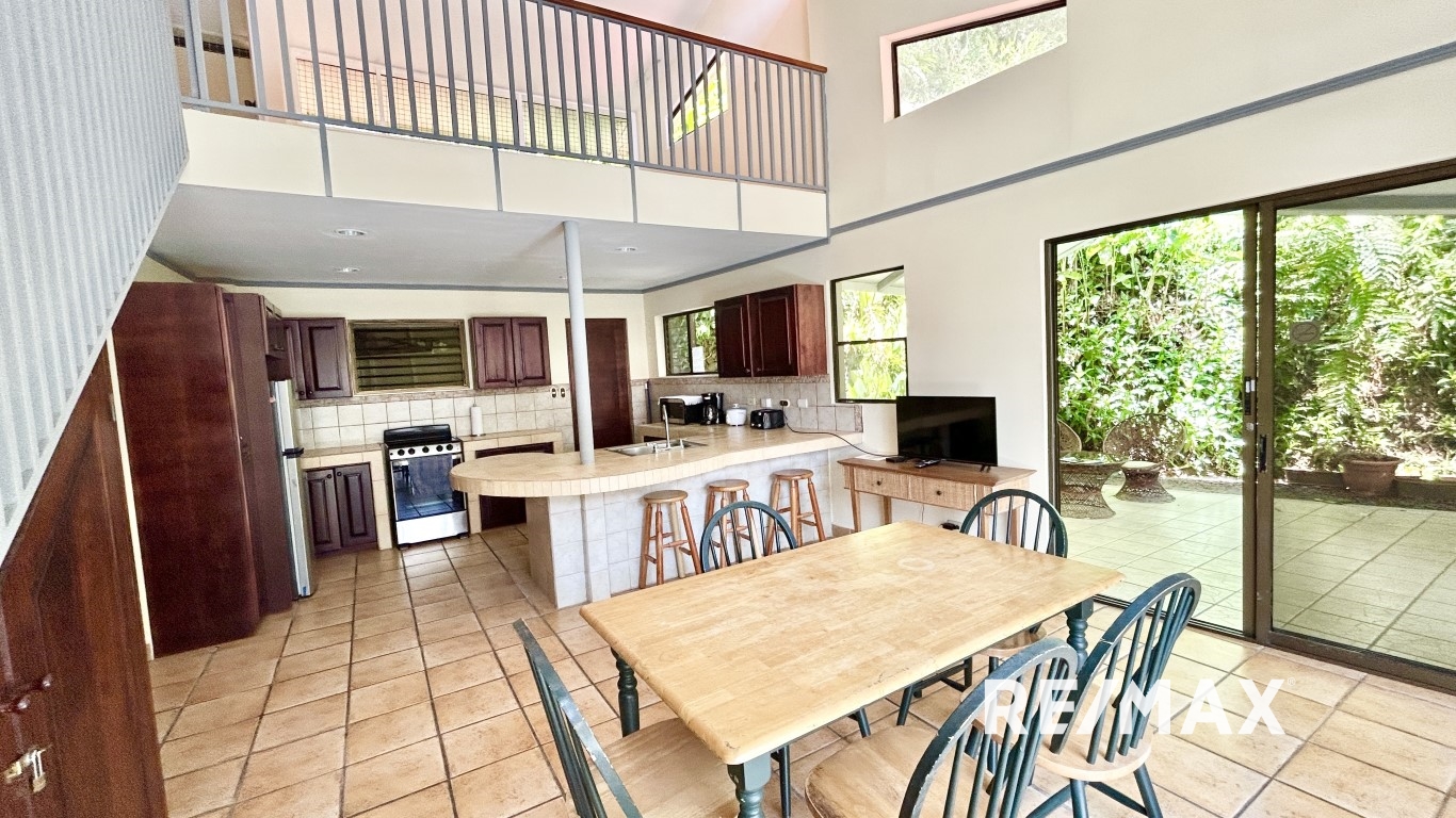 Lorsque vous approchez de la maison, vous êtes accueilli par son extérieur charmant, orné de fleurs tropicales vibrantes et de palmiers qui se balancent. En pénétrant à l’intérieur, vous vous retrouvez dans un espace de vie lumineux et aéré. De là, vos yeux sont attirés par les grandes portes coulissantes en verre qui s’ouvrent sur une terrasse et une piscine privées, prolongeant l’espace de vie à l’extérieur. La cuisine est compacte mais bien équipée, avec un grand espace de comptoir et tous les éléments essentiels pour vous permettre de cuisiner vos meilleurs plats pour vos convives. Préparez de délicieux repas en utilisant des ingrédients frais et locaux et savourez-les au bar du petit-déjeuner ou emmenez-les dehors sur la terrasse et dînez au milieu des sons paisibles de la nature.
