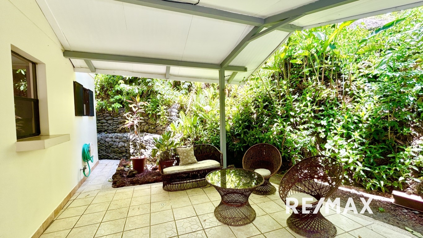 Enfin, en sortant sur la terrasse, vous êtes envoûté par l’ambiance tropicale. La terrasse est entourée de votre belle piscine privée décorée d’un joli hippocampe, d’un espace barbecue avec un évier extérieur et d’une petite table pour les repas en plein air. Entouré d’une végétation luxuriante, vous pourrez profiter de la tranquillité de l’extérieur, vous prélasser dans la chaleur du soleil et écouter le chant mélodieux des oiseaux.