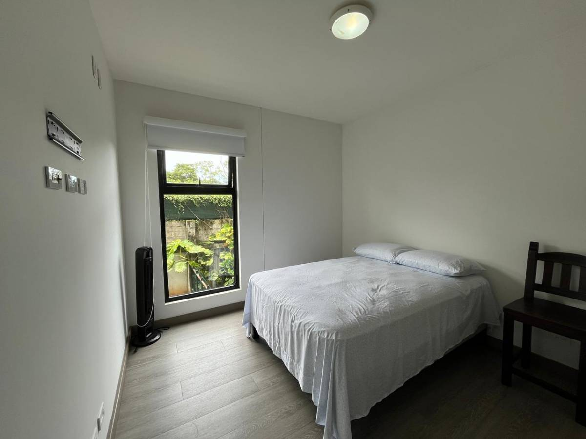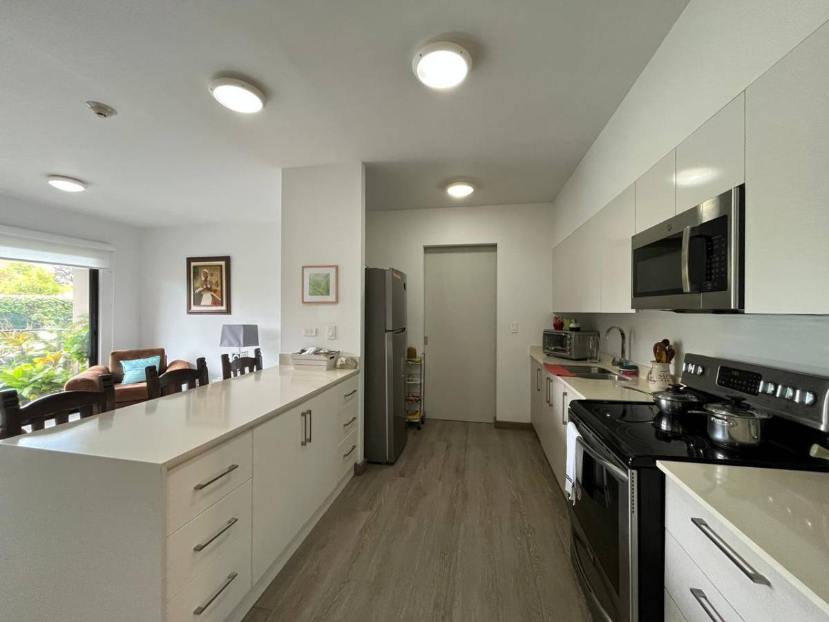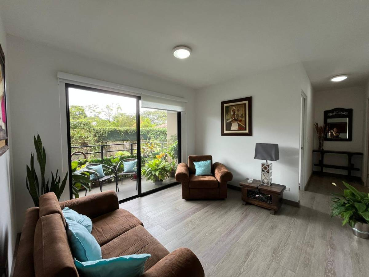Beautiful apartment for sale in a condominium in Brasil de Santa Ana, San José. 85 m² of construction on one level, built with concrete blocks and cement with laminate flooring.
