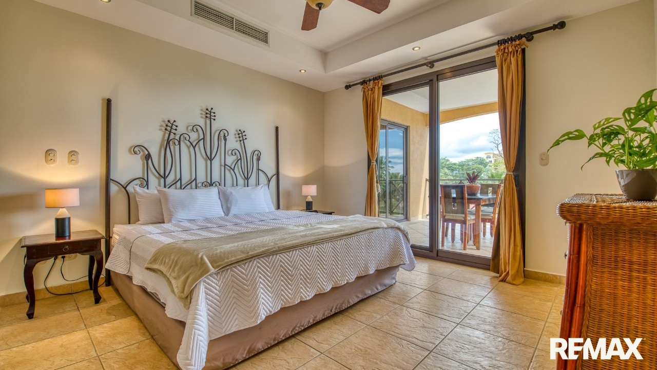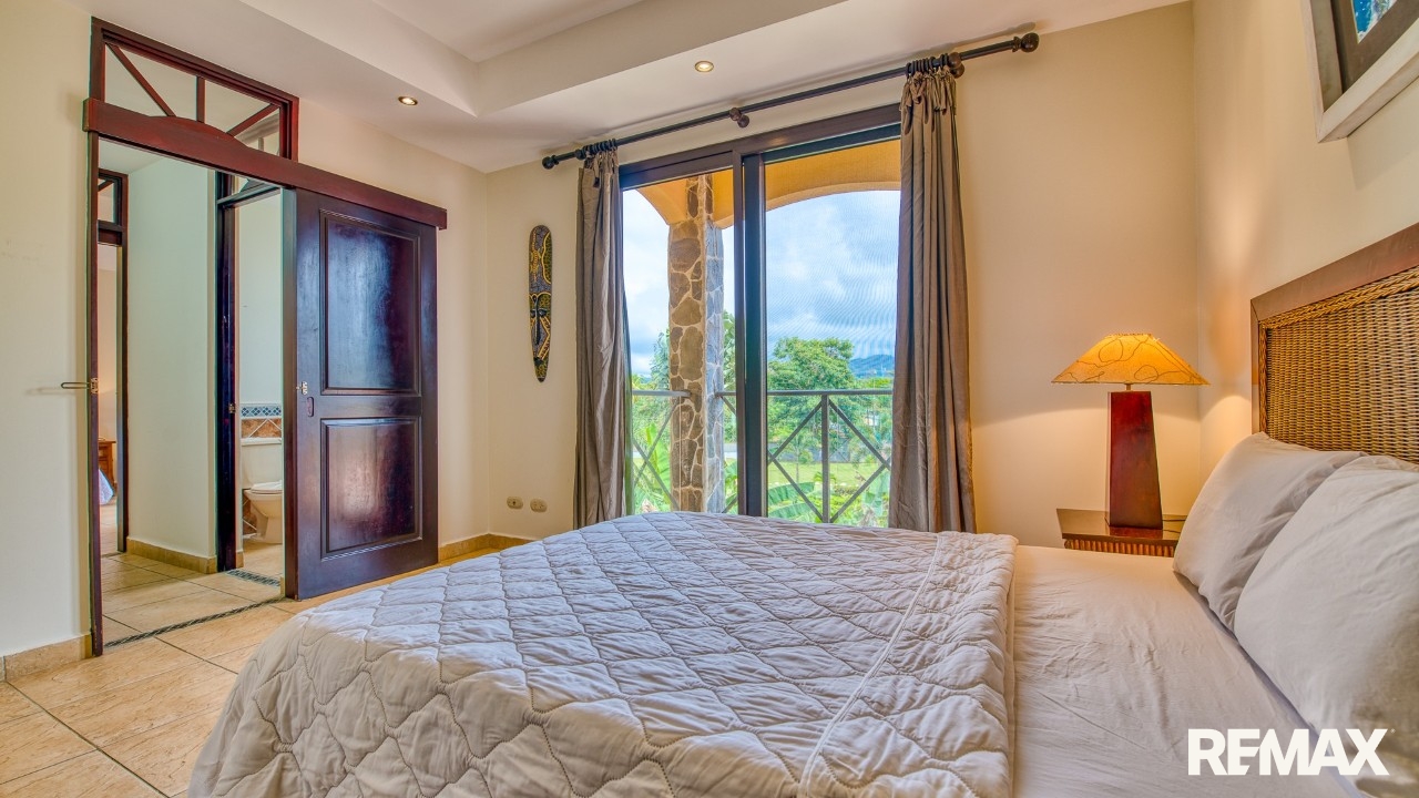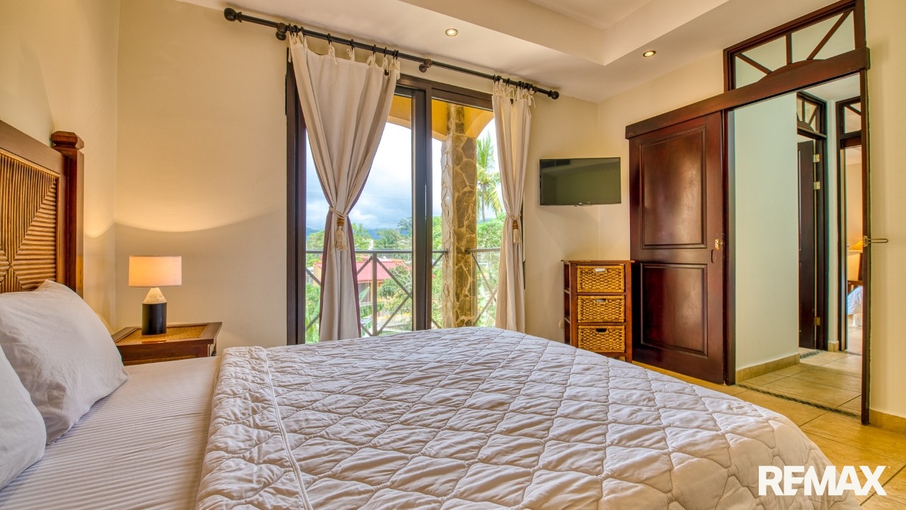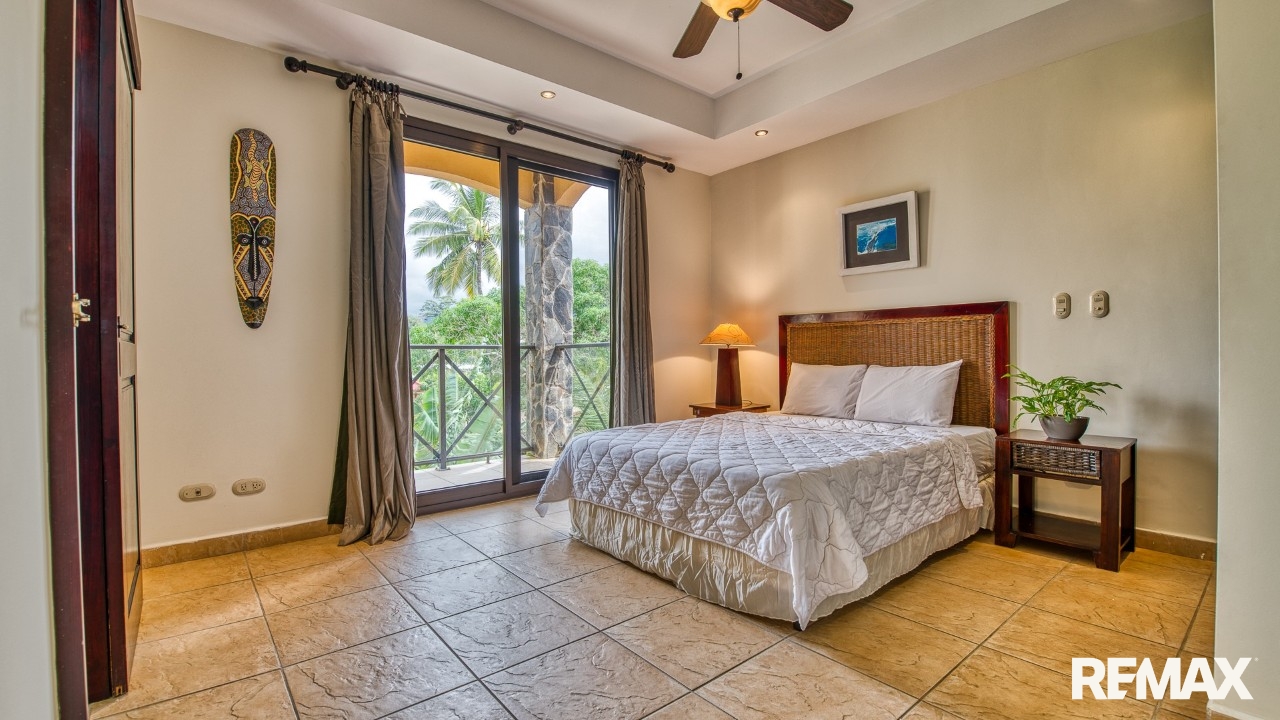 Every bedroom in this residence features its own private balcony overlooking the lush green hills that cradle Jaco—ideal for morning coffee or peaceful evenings. The spacious master suite includes a king-size bed, a walk-in closet, and a private ensuite bathroom complete with a bathtub for ultimate relaxation.