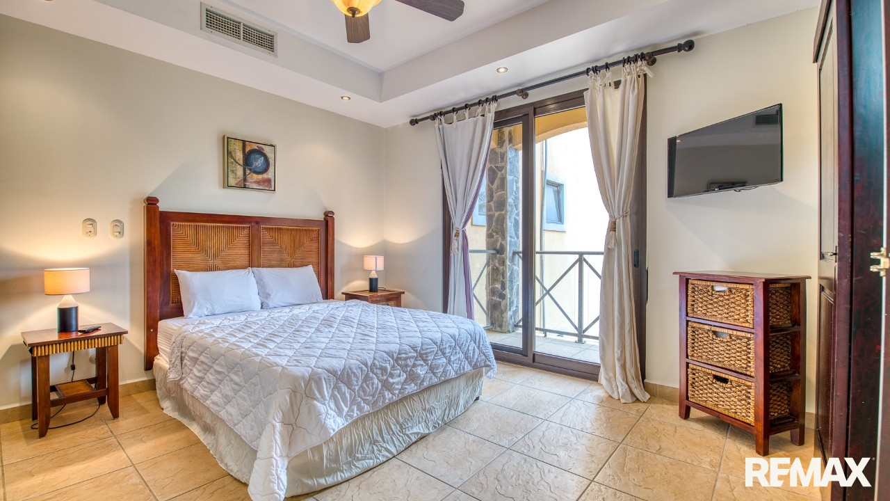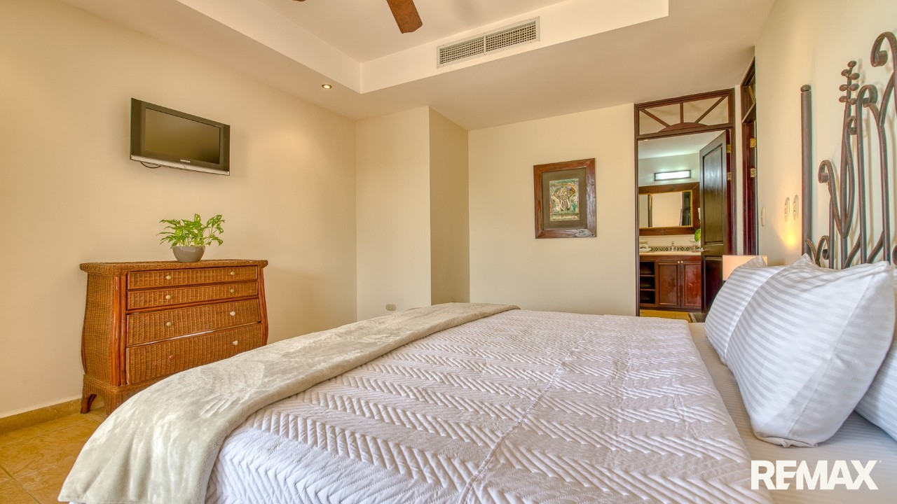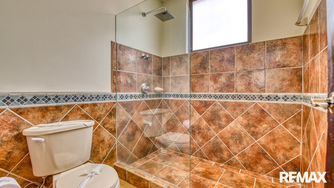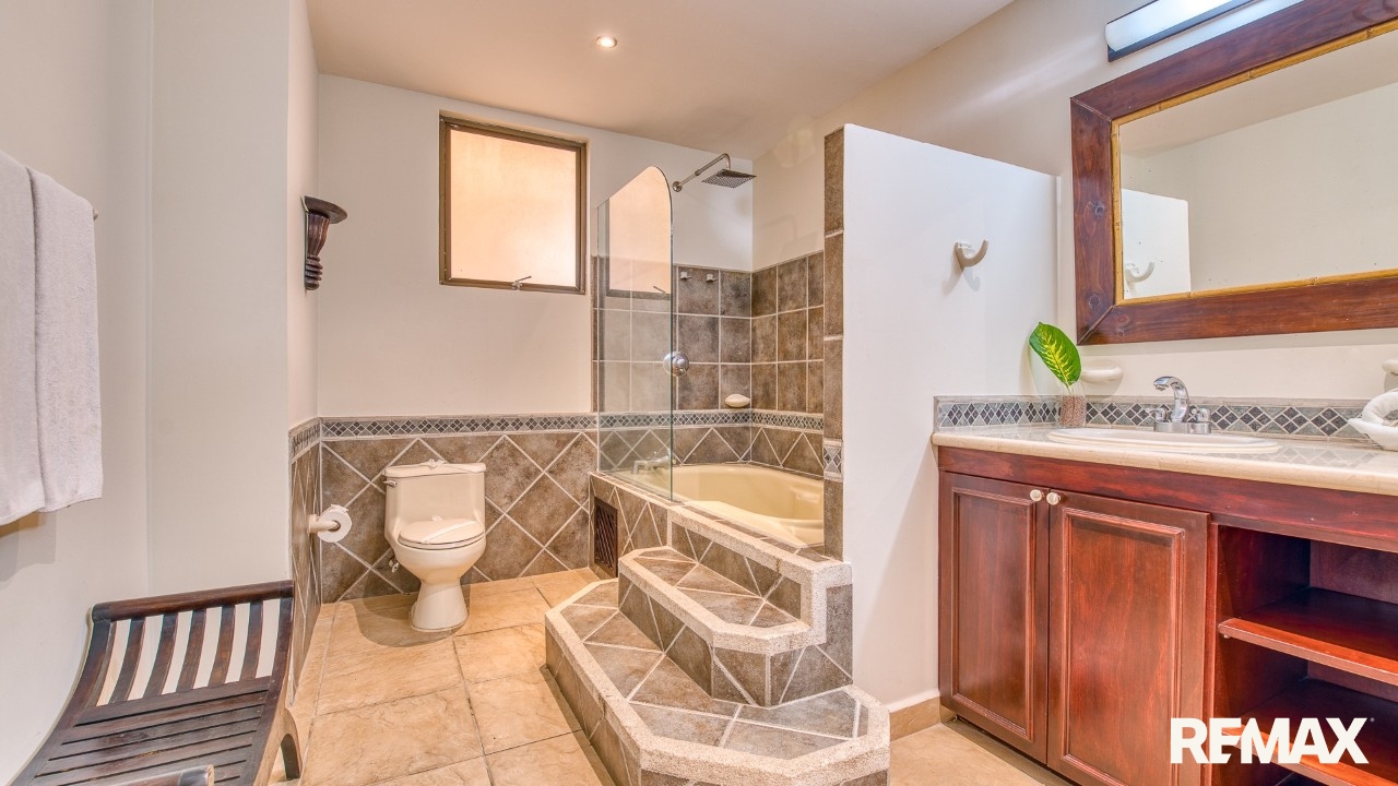 Every bedroom in this residence features its own private balcony overlooking the lush green hills that cradle Jaco—ideal for morning coffee or peaceful evenings. The spacious master suite includes a king-size bed, a walk-in closet, and a private ensuite bathroom complete with a bathtub for ultimate relaxation.