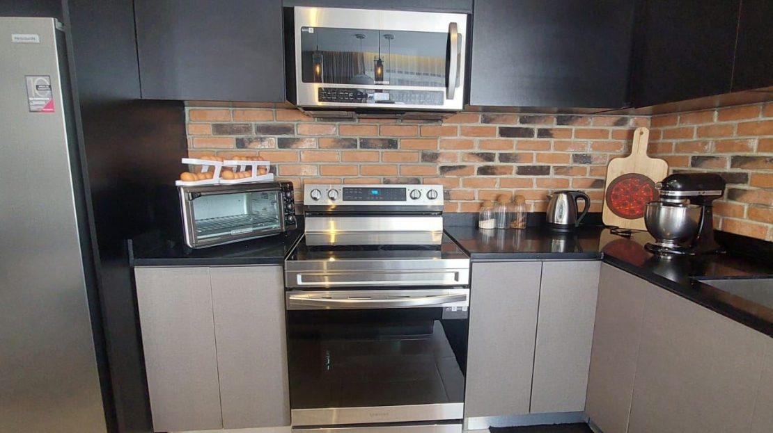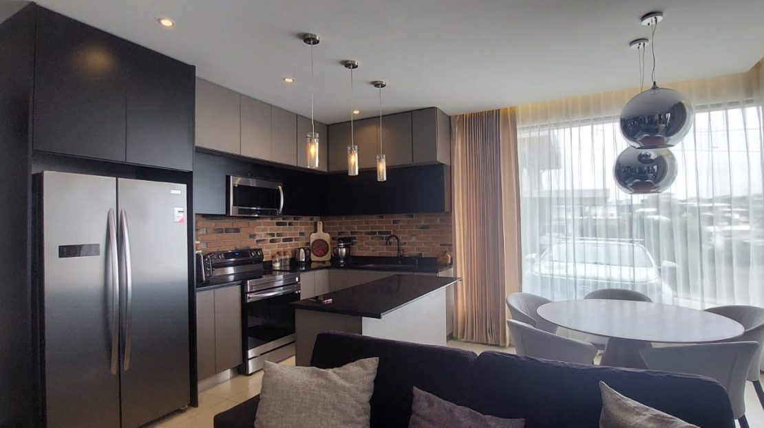 Includes refrigerator, stove, lamps, and curtains: Each unit is fully equipped with modern appliances and elegant finishes.