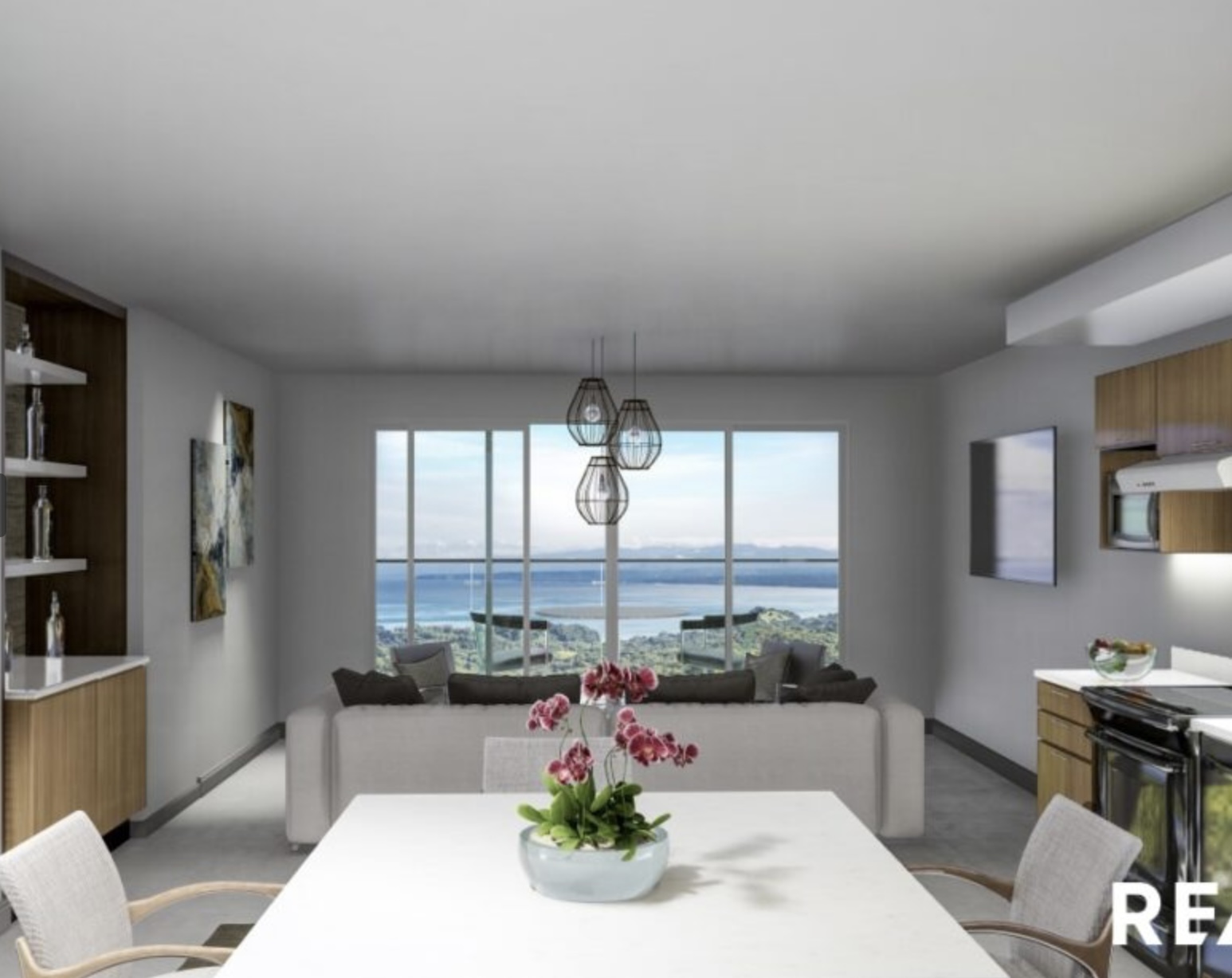 Gourmet Kitchen: The sleek, fully equipped kitchen features premium stainless steel appliances, beautiful countertops, and custom cabinetry, perfect for creating gourmet meals or simply enjoying your morning coffee with a view.