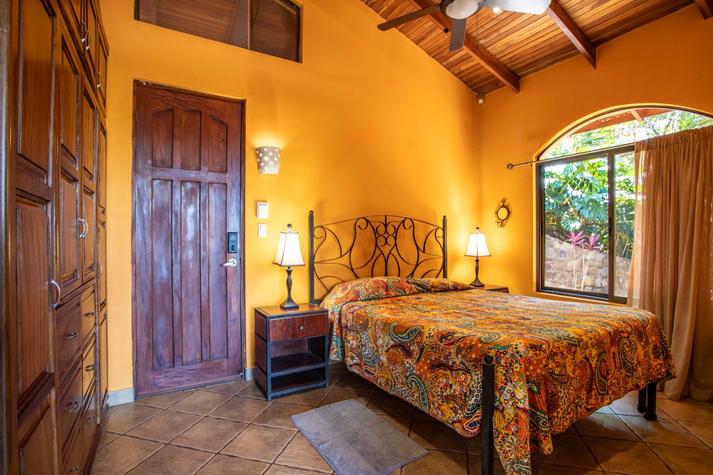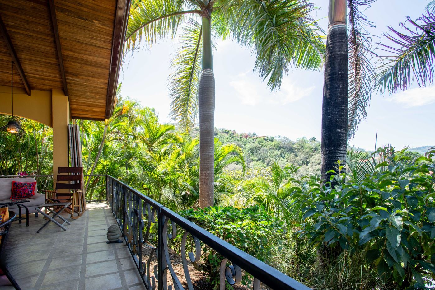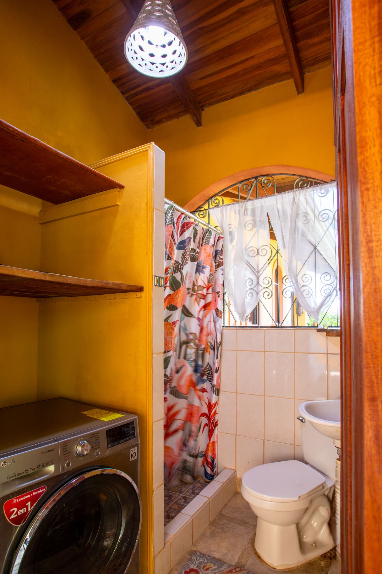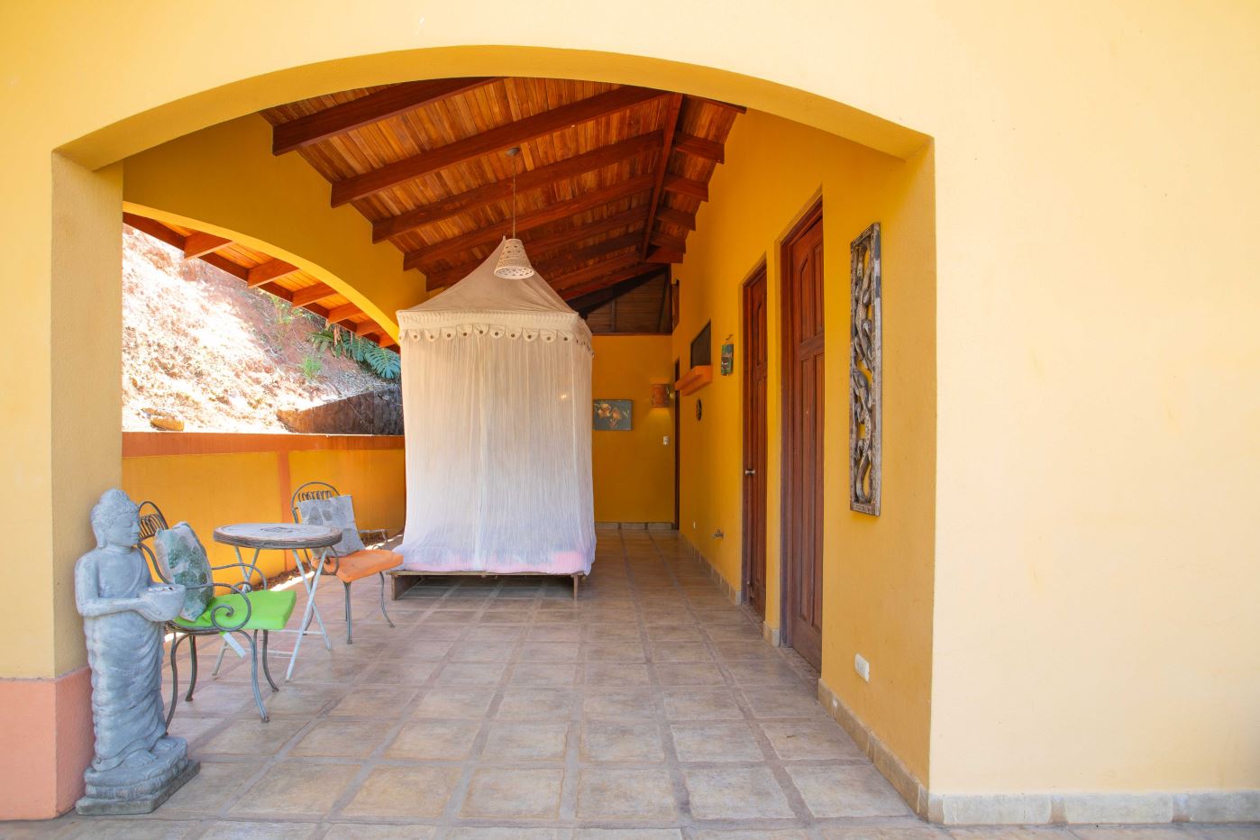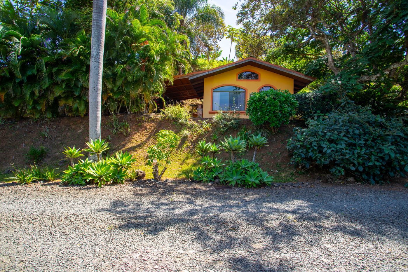 The Two Sisters Home (Casa de Las Hermanas) came to fruition when two sisters came to Costa Rica to create their dream homes and leaving room for the final grand home. They set the groundwork of landscaping, water, and electricity. The dream is waiting to be finished. Casa de Las Hermanas is a inviting 2 guest home property with the ideal spot for a larger home build. The entry of the property features a long private entrance where one can find the first smaller home that sits atop a small hill and has nice views of the area mountains and downtown Atenas. The 650ft2 (60 m2) studio home has artesenal woodwork throughout including the tall ceilings. There are Spanish Colonial finishes throughout. There is a kitchenette and a full bathroom. Adjacent is a small storage shed and a covered porch area with a front and back entrance into the home.