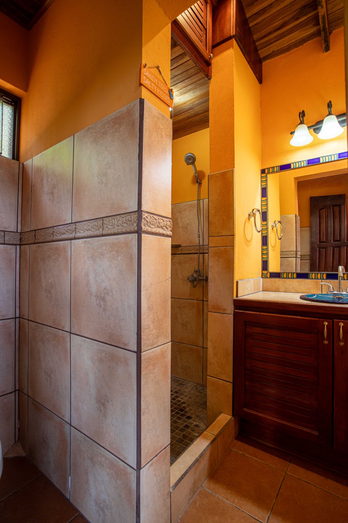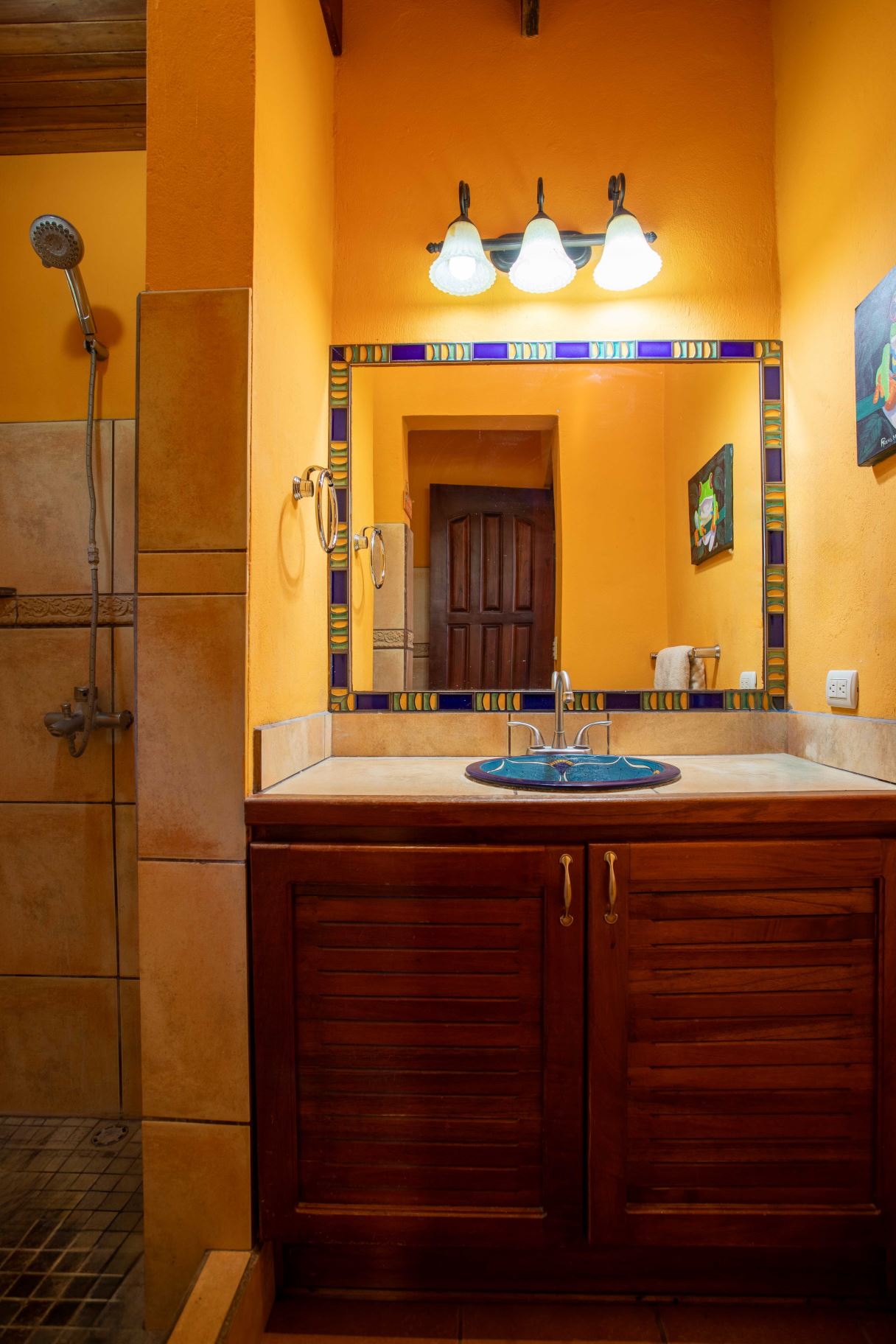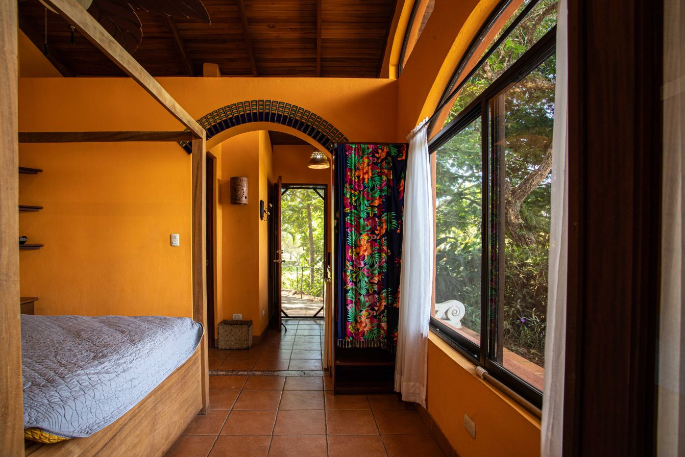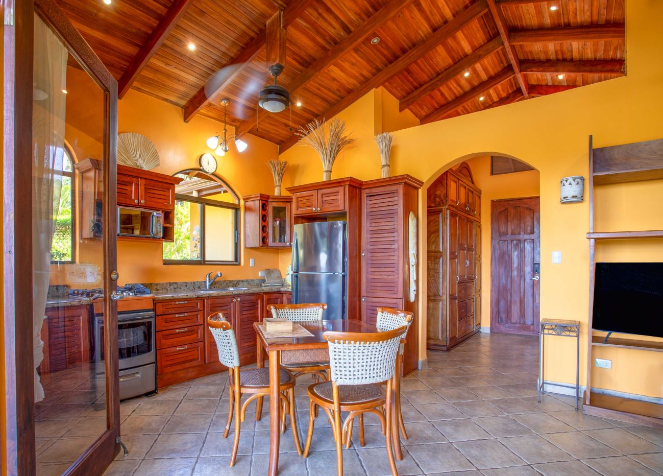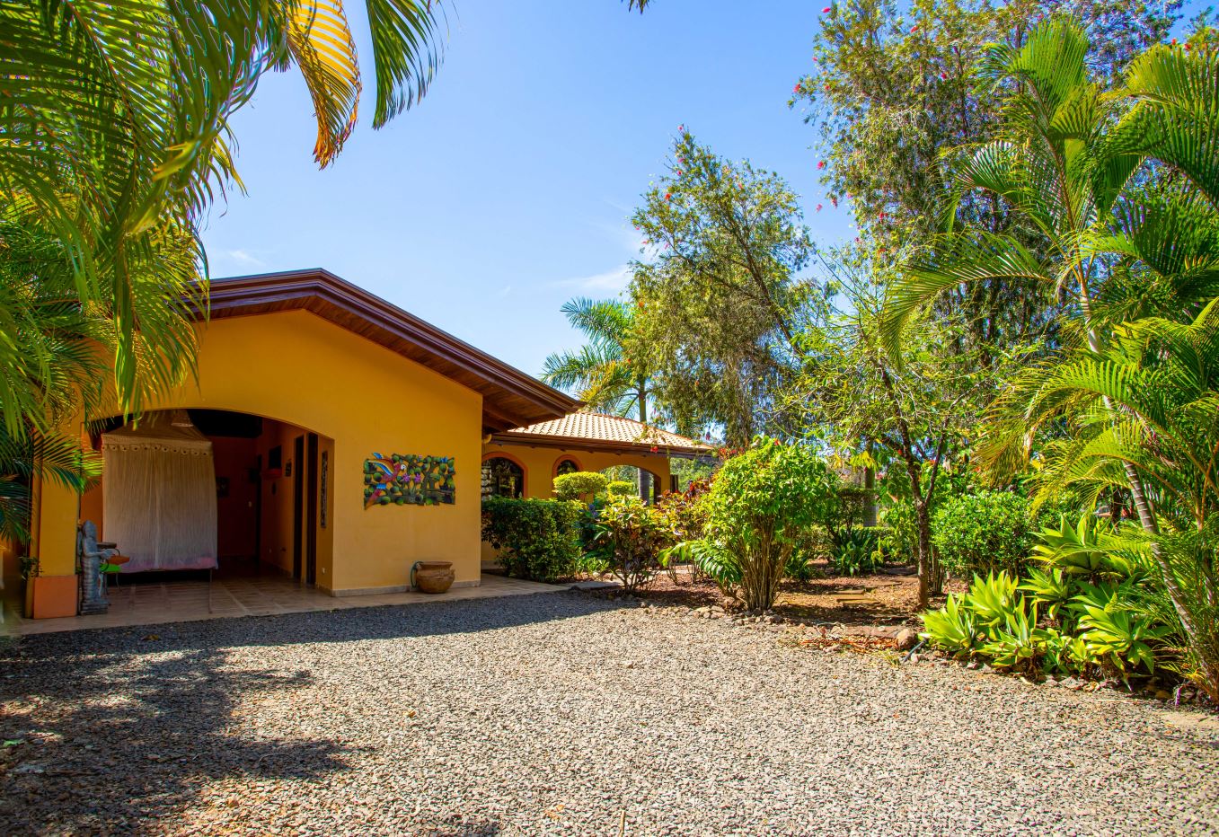 The Two Sisters Home (Casa de Las Hermanas) came to fruition when two sisters came to Costa Rica to create their dream homes and leaving room for the final grand home. They set the groundwork of landscaping, water, and electricity. The dream is waiting to be finished. Casa de Las Hermanas is a inviting 2 guest home property with the ideal spot for a larger home build. The entry of the property features a long private entrance where one can find the first smaller home that sits atop a small hill and has nice views of the area mountains and downtown Atenas. The 650ft2 (60 m2) studio home has artesenal woodwork throughout including the tall ceilings. There are Spanish Colonial finishes throughout. There is a kitchenette and a full bathroom. Adjacent is a small storage shed and a covered porch area with a front and back entrance into the home.
