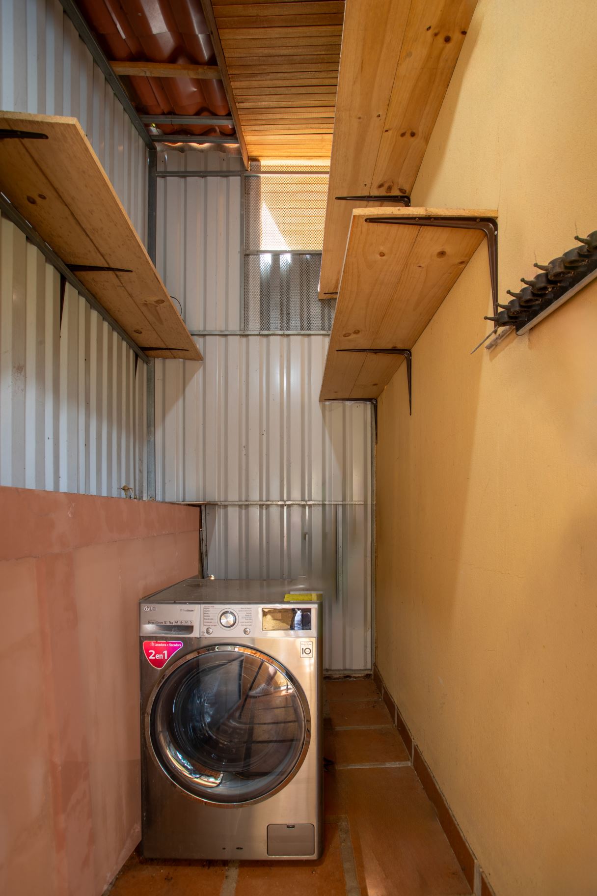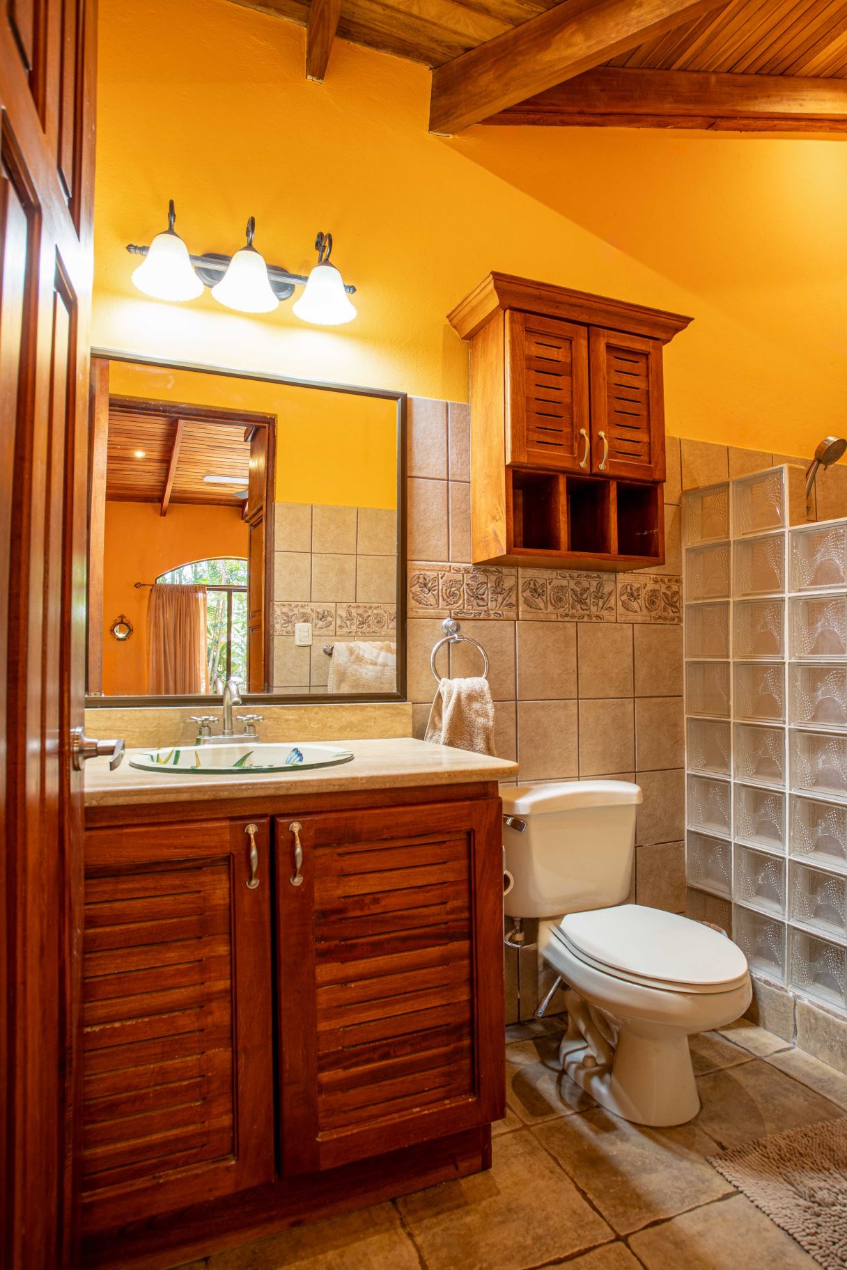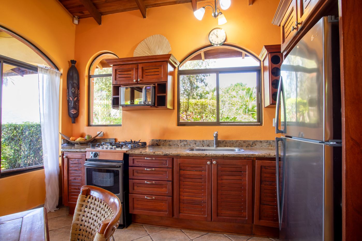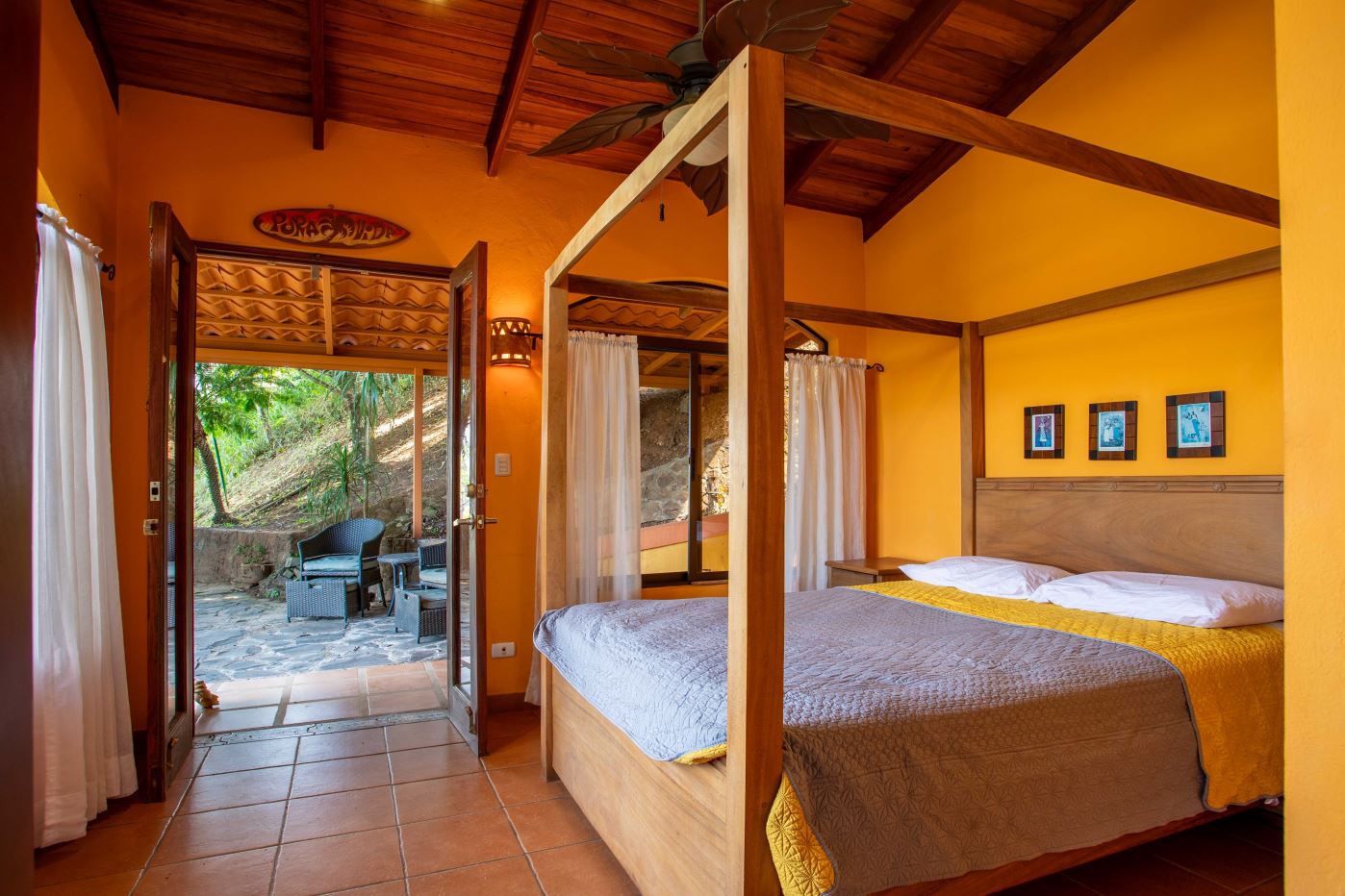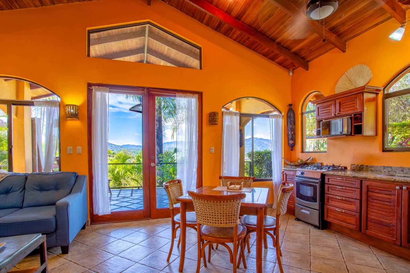 The Two Sisters Home (Casa de Las Hermanas) came to fruition when two sisters came to Costa Rica to create their dream homes and leaving room for the final grand home. They set the groundwork of landscaping, water, and electricity. The dream is waiting to be finished. Casa de Las Hermanas is a inviting 2 guest home property with the ideal spot for a larger home build. The entry of the property features a long private entrance where one can find the first smaller home that sits atop a small hill and has nice views of the area mountains and downtown Atenas. The 650ft2 (60 m2) studio home has artesenal woodwork throughout including the tall ceilings. There are Spanish Colonial finishes throughout. There is a kitchenette and a full bathroom. Adjacent is a small storage shed and a covered porch area with a front and back entrance into the home.