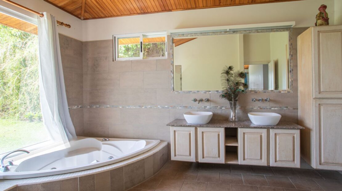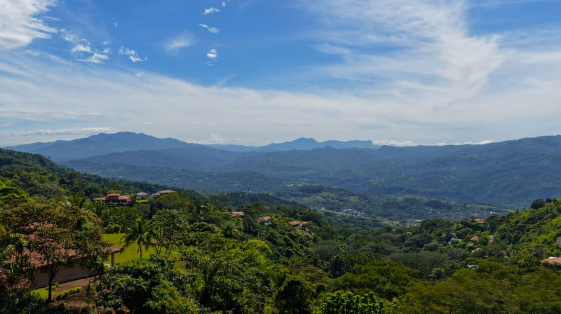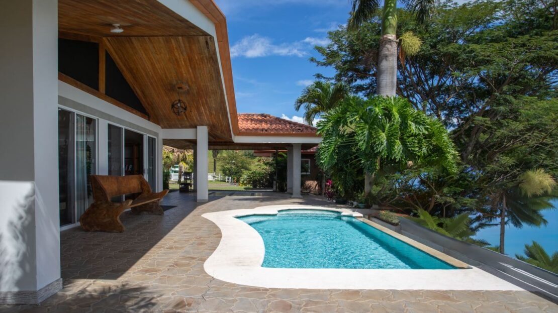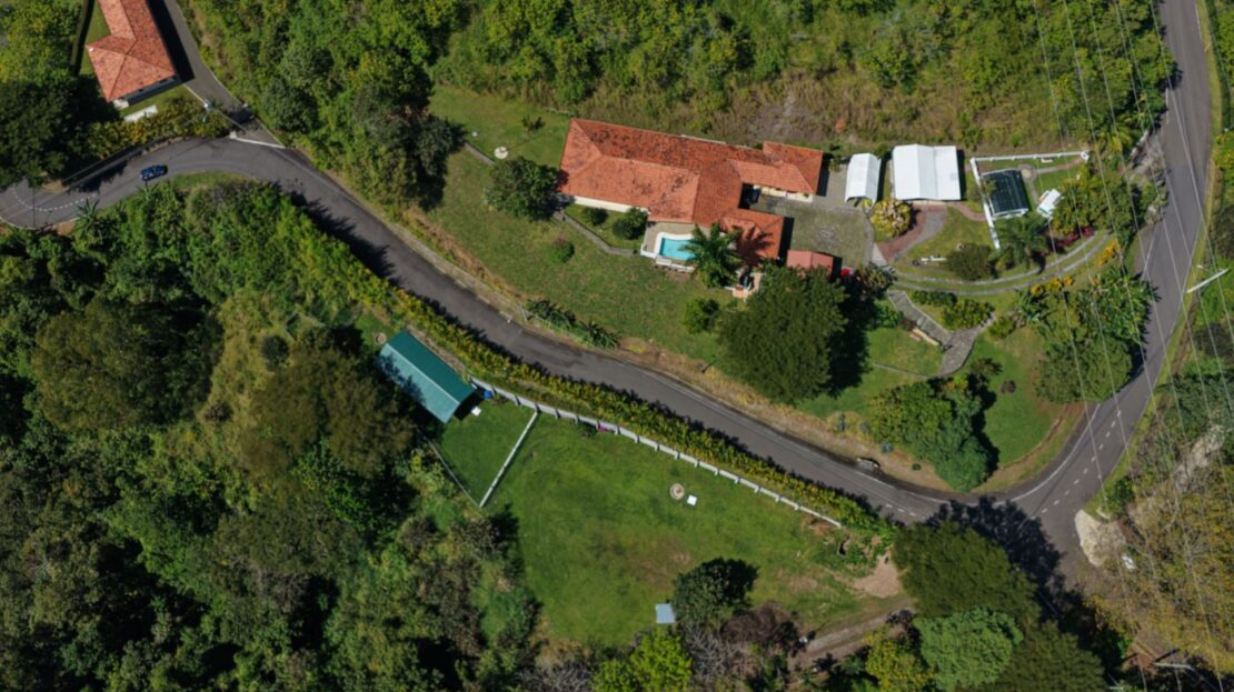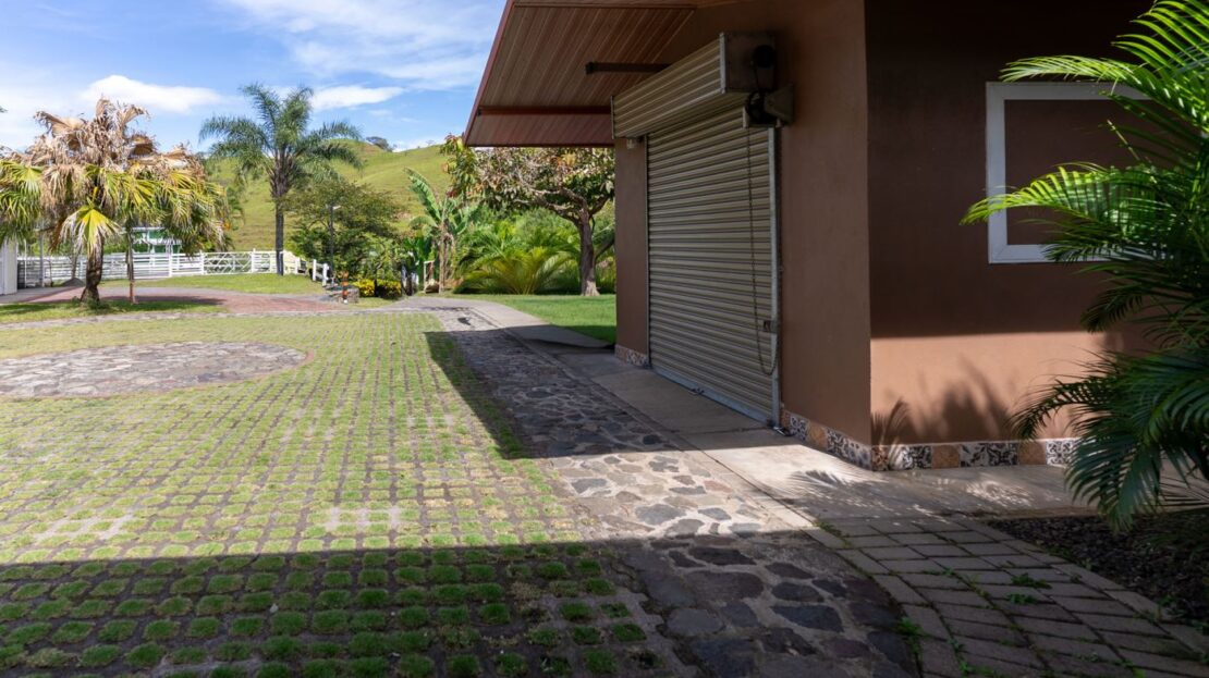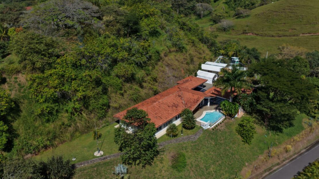 This elegant Mediterranean-Style Home is located in the exclusive community of Hacienda Atenas which is located just 6 minutes from town center but is in the relaxed countryside and cooler climate hills above Atenas Center with plenty of elbow room between the area’s homes.  The long private entrance of the home features several storage and garage areas which can easily be refurbished to any number of uses.  There’s plenty of parking ideal for a crowd and the property is nicely surrounded by manicured gardens.  There is plenty of outside covered porch areas ideal for outside living.  There’s a nice size swimming pool with an infinity edge with inviting deck areas that overlook the amazing area mountains.