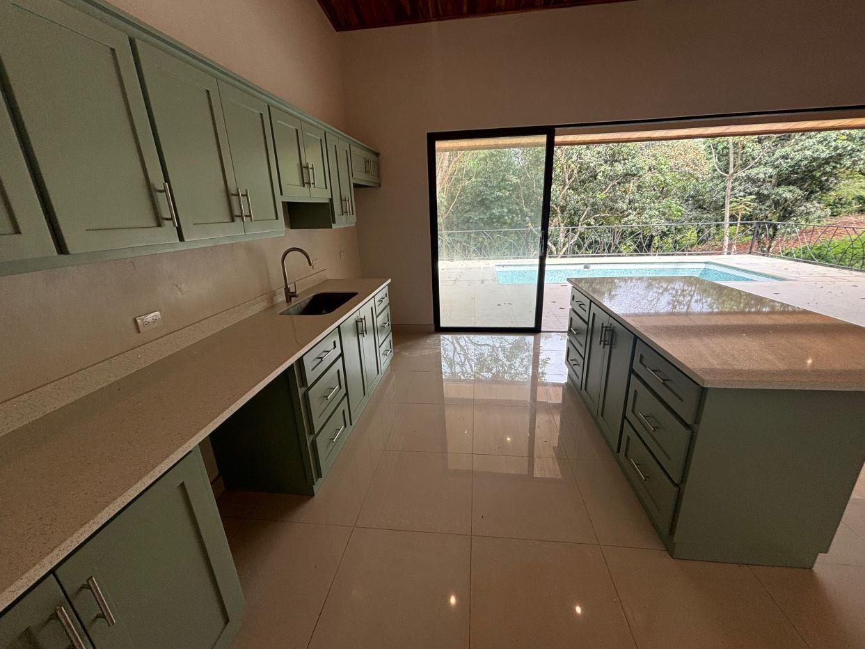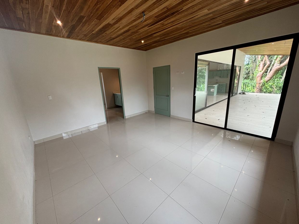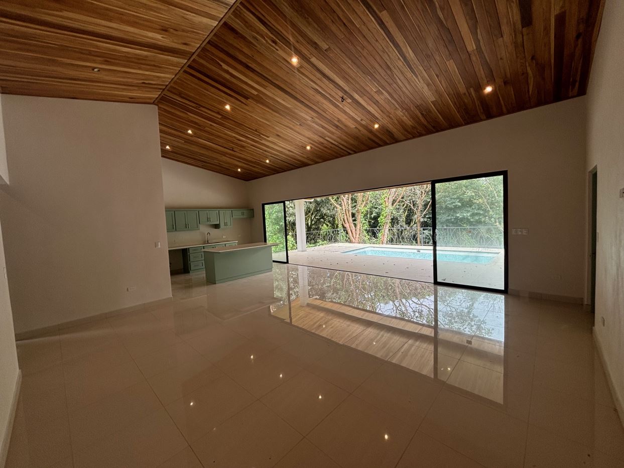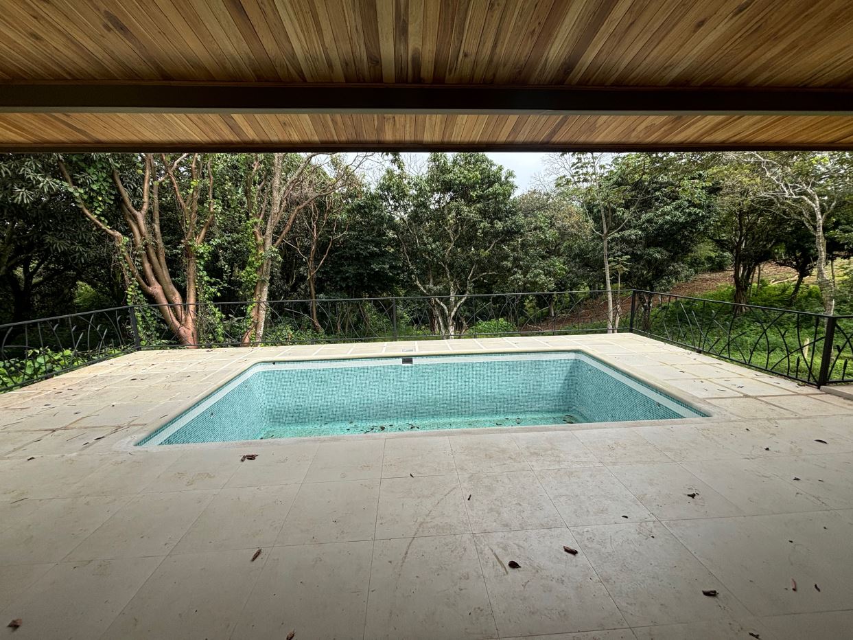 Gorgeous new modern-style home in exclusive neighborhood with 1/2 acre of land is located less than 10 minutes from Atenas Center in a natural setting in an established area with many neighboring homes. The home has a large back yard with plenty of trees that leads to an inviting back deck and pool area with a nice size covered terrace perfect for outside living. The home has an open floor plan with artesenal cabinetry kitchen with an ample living and dining area. One wing has the master bedroom and bathroom suite area with a nicely designed terrace just outside a sliding glass door. There is a nice size walk in closet. On the other wing are two guest rooms, a shared bathroom and adjacent the kitchen a living and storage area.