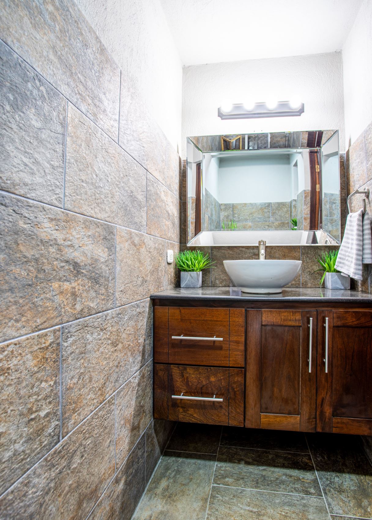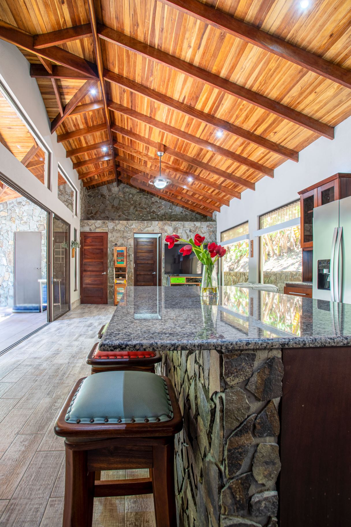 Located in the gated community of Selva Rio Estates, this beautiful and well maintained 2 bedroom 2.5 bathroom pool home (3 bedroom, 3.5 bath, with casita), a scenic 15 minutes drive from downtown Atenas and only a few minutes drive to Ruta 27. Some of the many features of this home include a large open living area with vaulted wood ceilings, natural stone accent walls, tons of windows and sliding glass doors for a light and airy feel. The house has a custom kitchen with island, solid wood Spanish cedar cabinetry, granite countertops, and matching stainless steel appliances. Spacious dual master bedrooms layout with built-in closets, each with ensuite spa-like bathrooms with walk-in showers, granite topped vanities and custom matching cabinetry. Both bedrooms are fully air conditioned. Just off the main living space is a large covered terrace overlooking the infinity pool with stunning river and jungle views. The extremely private natural setting accents and influenced the house’s design.