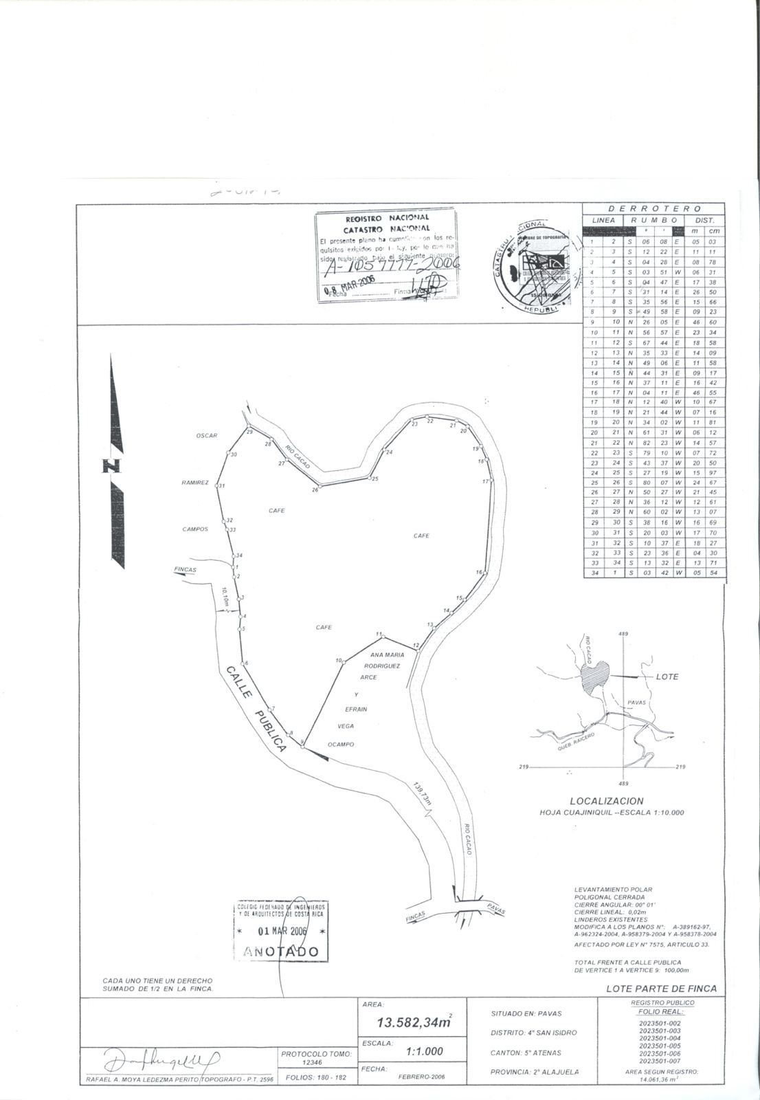 13,582 m2 (3.5 acres) property with 150 meters (492 feet) of public street frontage and 280 meters (920 feet) of Cacao River frontage.Located in San Isidro de Atenas, 8 km from the city center, with paved roads, electricity, water, and internet.