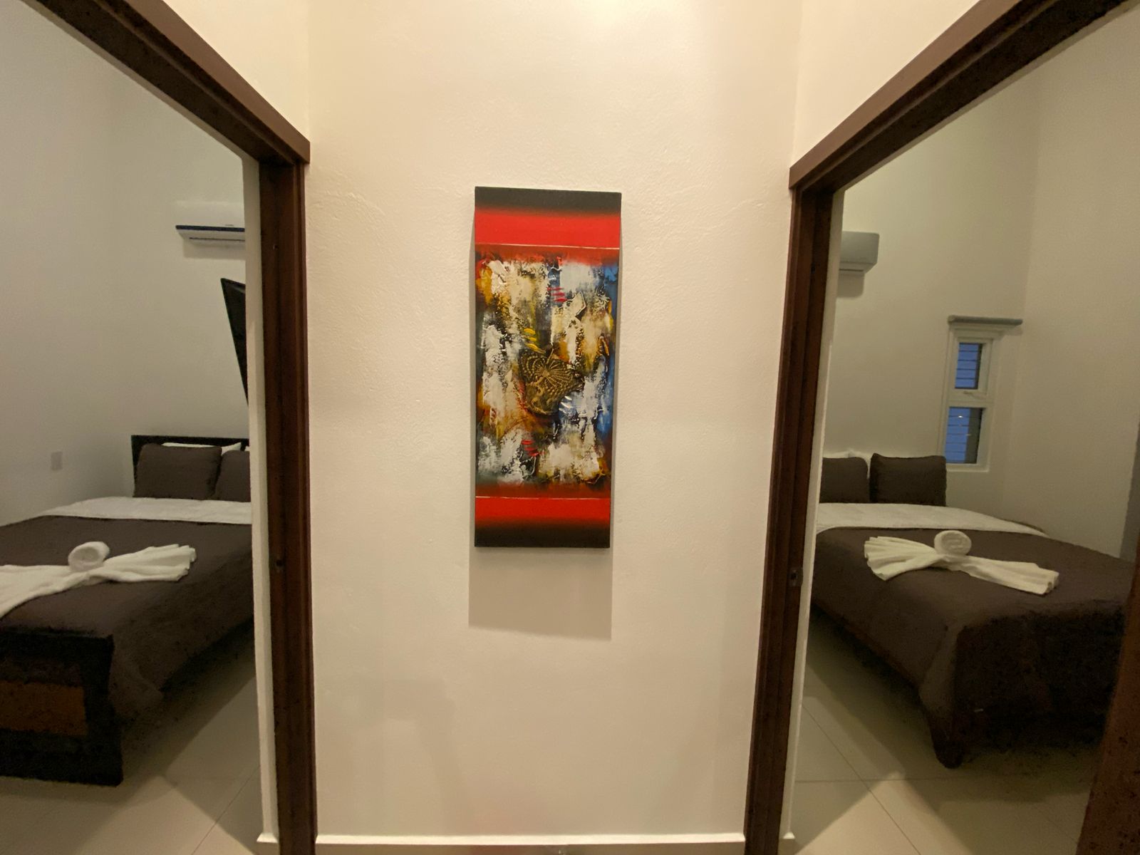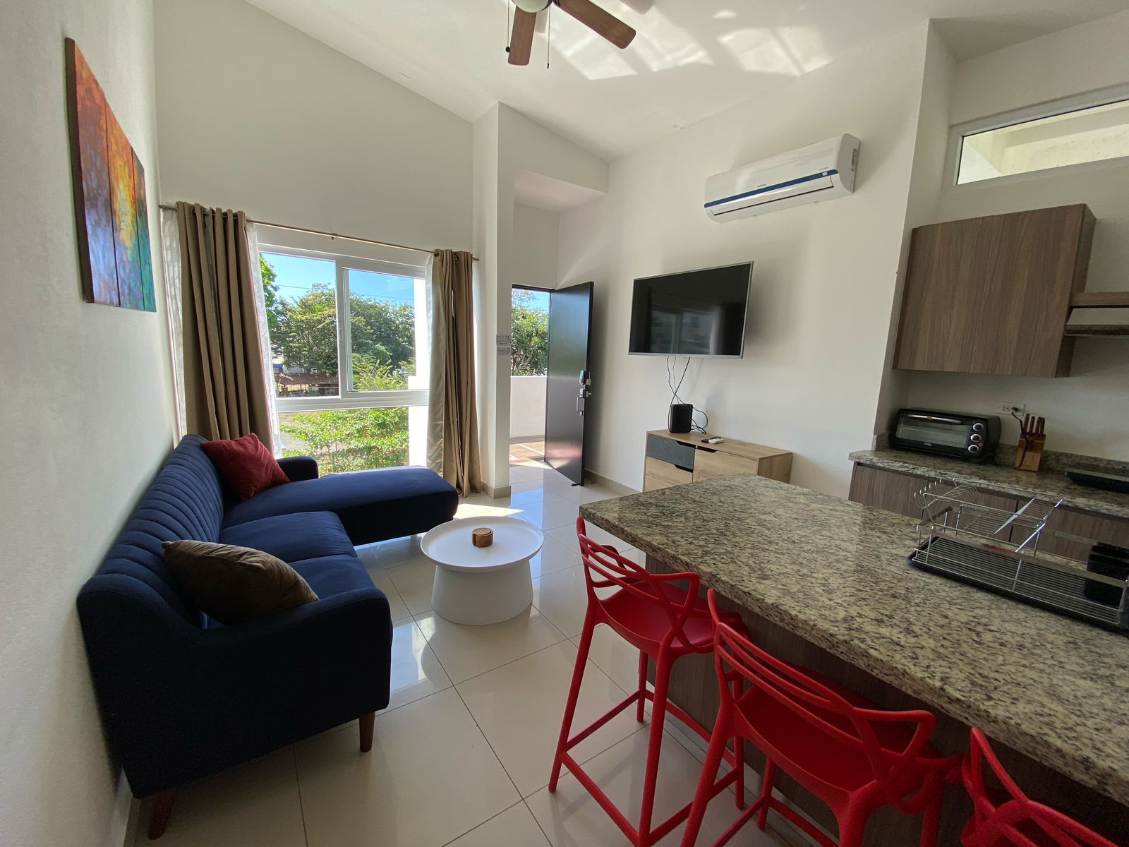 The open-concept kitchen flows seamlessly into the living room, which includes air conditioning and a flat-screen TV. Both bedrooms are also equipped with A/C and TVs, providing a comfortable and private atmosphere.