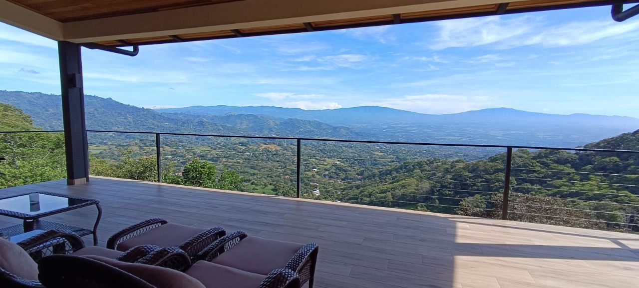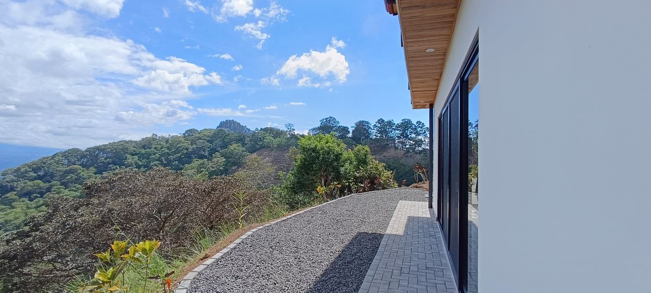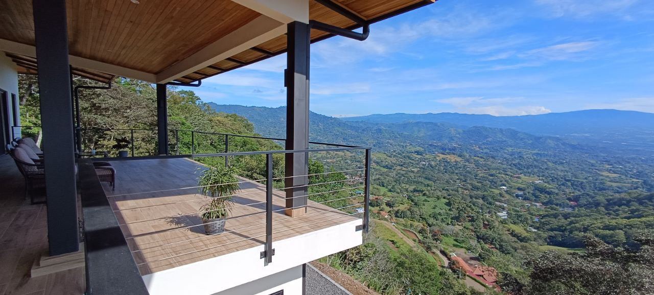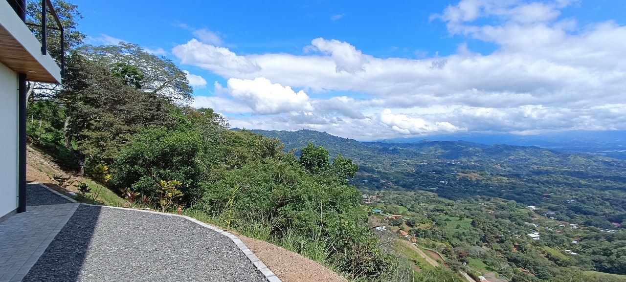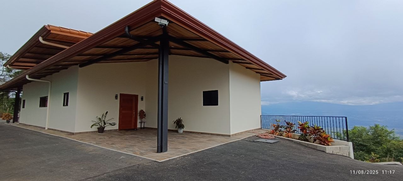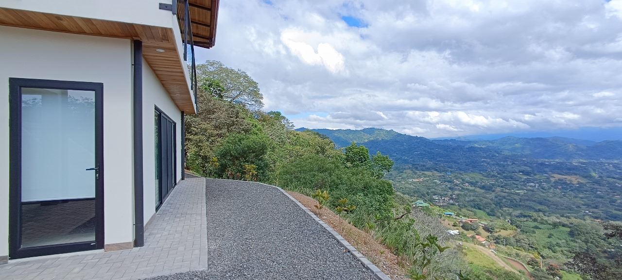 Majestic new home on top of an Atenas private community overlooking The Central Valley with amazing panoramic views of the area mountains in the cooler climates of Barrio Jesus, located just 9 minutes from town center.  The home is brand new and finished in 2025.  The setting is a very private and secure location adjacent the Atenas coffee farms with a long private entrance leading to the plentiful covered parking area.  The landscaped yard is large enough to have a private orchard and the back yard is spacious enough to allow for a swimming pool area.  There is a secondary location of the pool in front of the downstair apartment with room for an extra large deck also with mouthdropping views.  When one walks into the open floor plan design the elaborate cathederal ceilings provides a feeling of spaciousness and light throughout the social area.  There is artesenal cabinerty in the spacious kitchen and nicely designed wooden doors throughout the home.  The kitchen, dining and living room lead way to an inviting large covered deck with an eagle’s eye view of the stellar scenery.