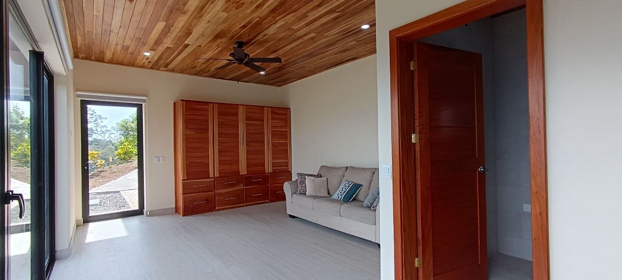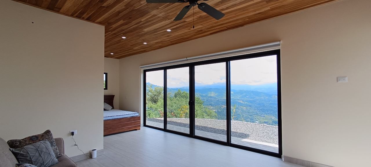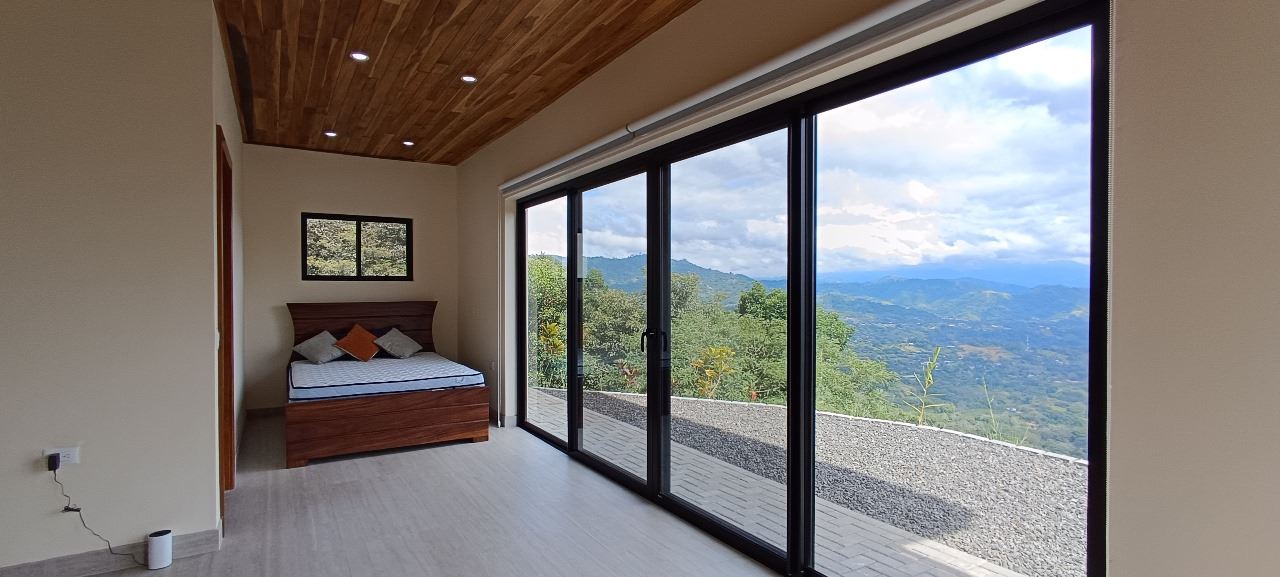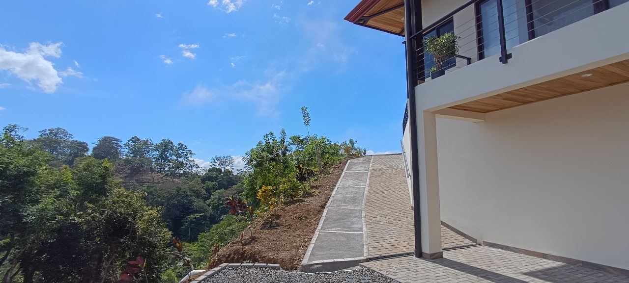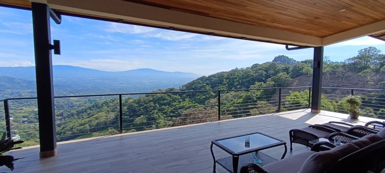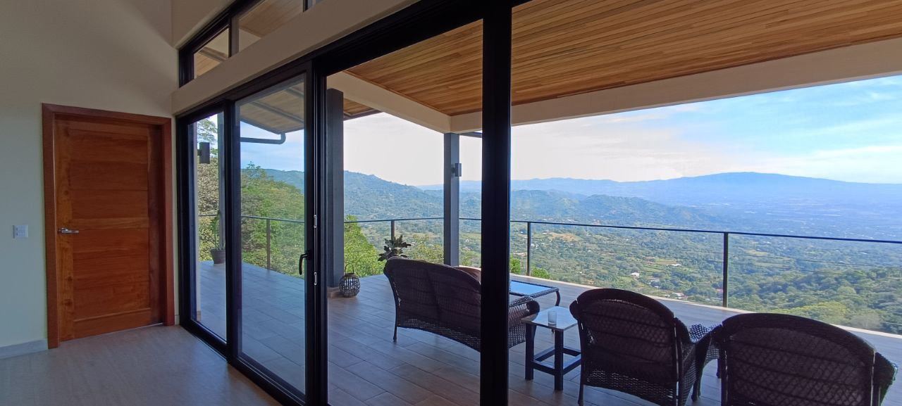 Majestic new home on top of an Atenas private community overlooking The Central Valley with amazing panoramic views of the area mountains in the cooler climates of Barrio Jesus, located just 9 minutes from town center.  The home is brand new and finished in 2025.  The setting is a very private and secure location adjacent the Atenas coffee farms with a long private entrance leading to the plentiful covered parking area.  The landscaped yard is large enough to have a private orchard and the back yard is spacious enough to allow for a swimming pool area.  There is a secondary location of the pool in front of the downstair apartment with room for an extra large deck also with mouthdropping views.  When one walks into the open floor plan design the elaborate cathederal ceilings provides a feeling of spaciousness and light throughout the social area.  There is artesenal cabinerty in the spacious kitchen and nicely designed wooden doors throughout the home.  The kitchen, dining and living room lead way to an inviting large covered deck with an eagle’s eye view of the stellar scenery.