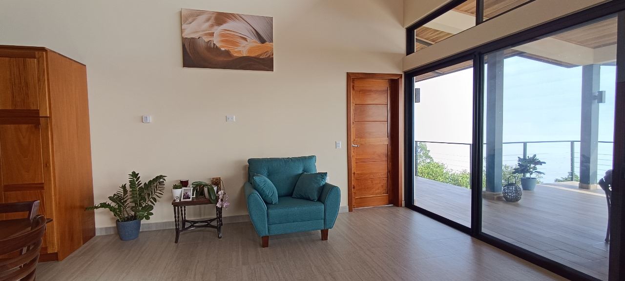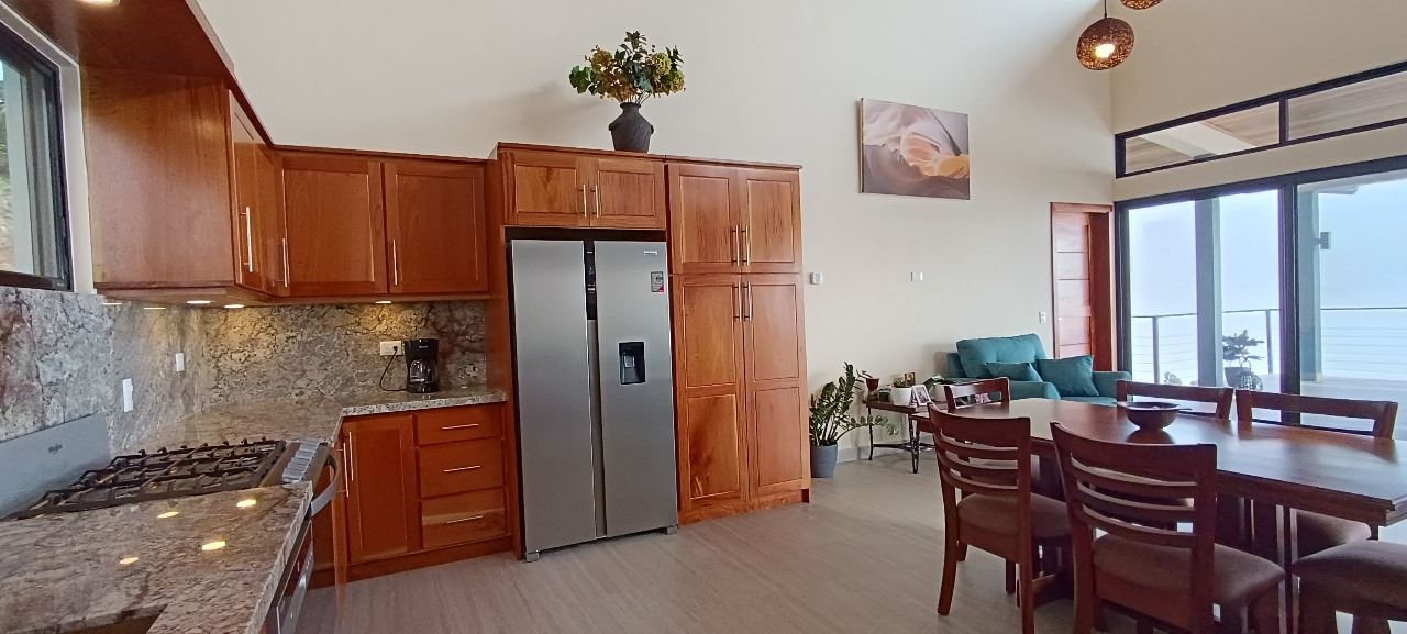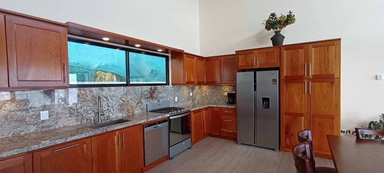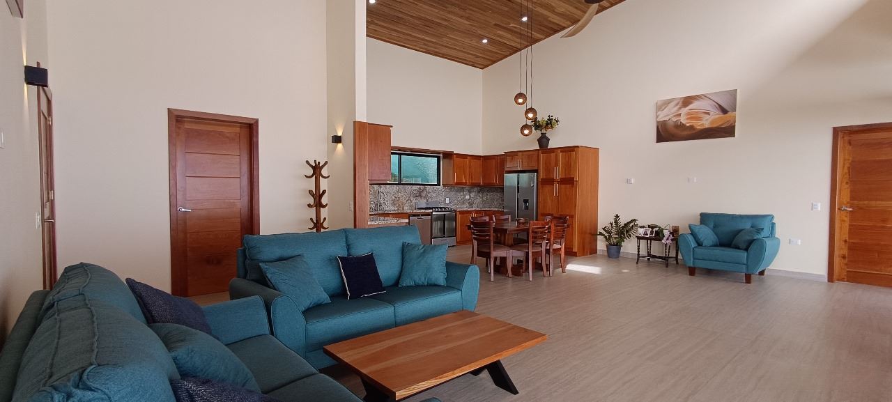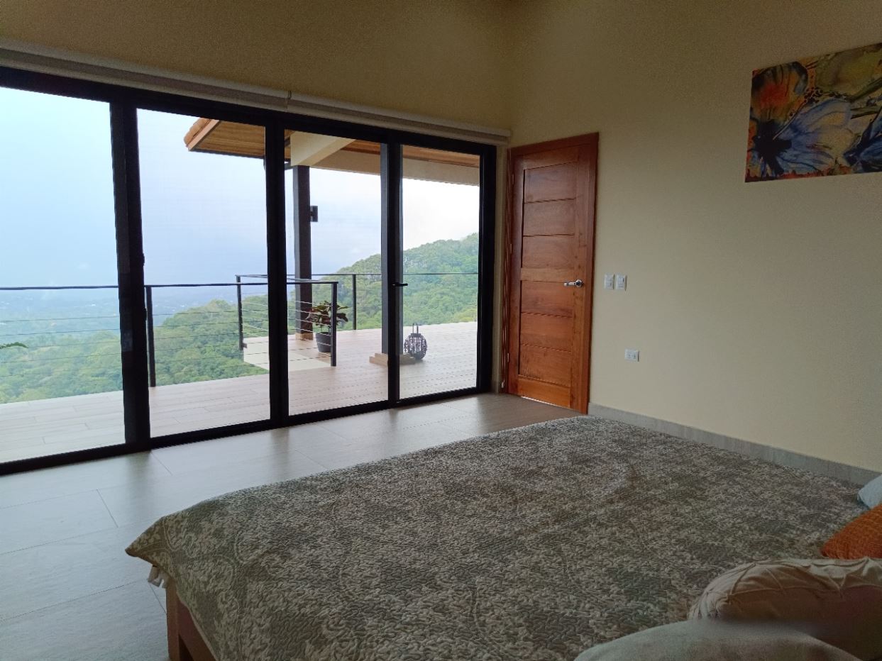 Majestic new home on top of an Atenas private community overlooking The Central Valley with amazing panoramic views of the area mountains in the cooler climates of Barrio Jesus, located just 9 minutes from town center.  The home is brand new and finished in 2025.  The setting is a very private and secure location adjacent the Atenas coffee farms with a long private entrance leading to the plentiful covered parking area.  The landscaped yard is large enough to have a private orchard and the back yard is spacious enough to allow for a swimming pool area.  There is a secondary location of the pool in front of the downstair apartment with room for an extra large deck also with mouthdropping views.  When one walks into the open floor plan design the elaborate cathederal ceilings provides a feeling of spaciousness and light throughout the social area.  There is artesenal cabinerty in the spacious kitchen and nicely designed wooden doors throughout the home.  The kitchen, dining and living room lead way to an inviting large covered deck with an eagle’s eye view of the stellar scenery.