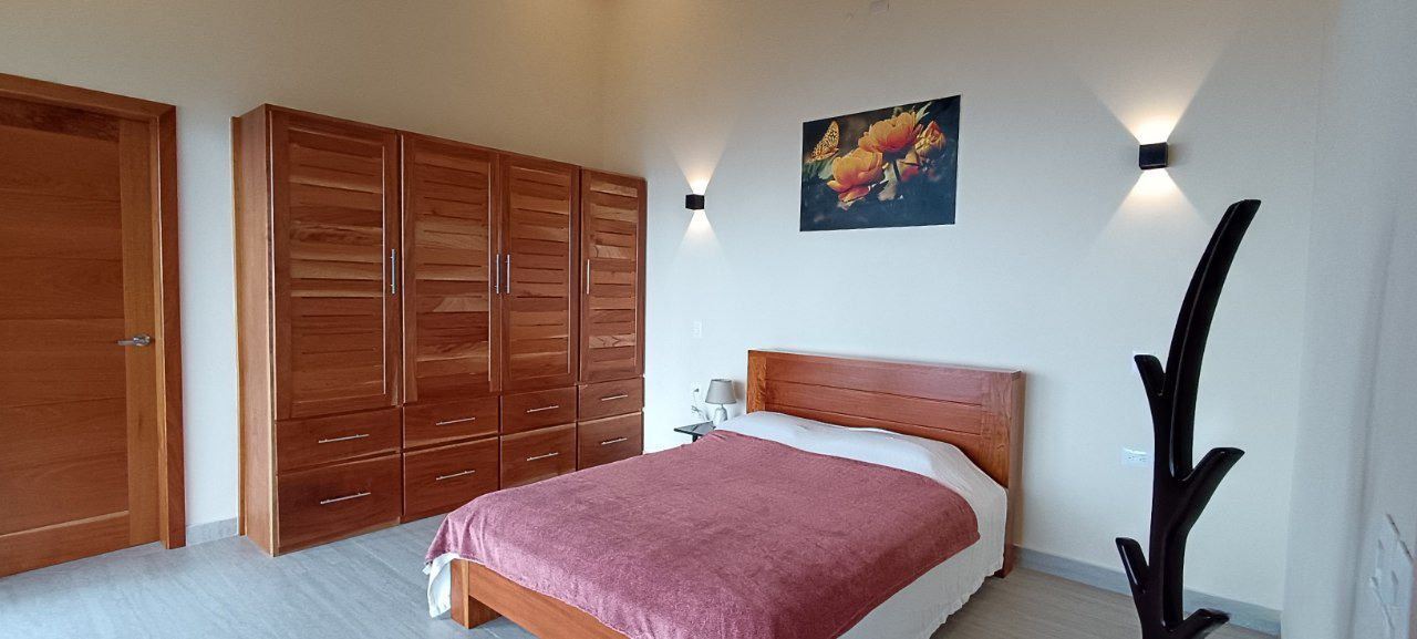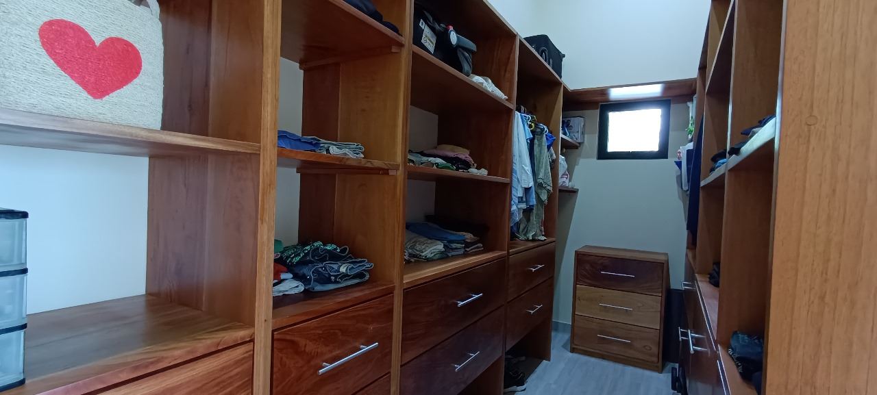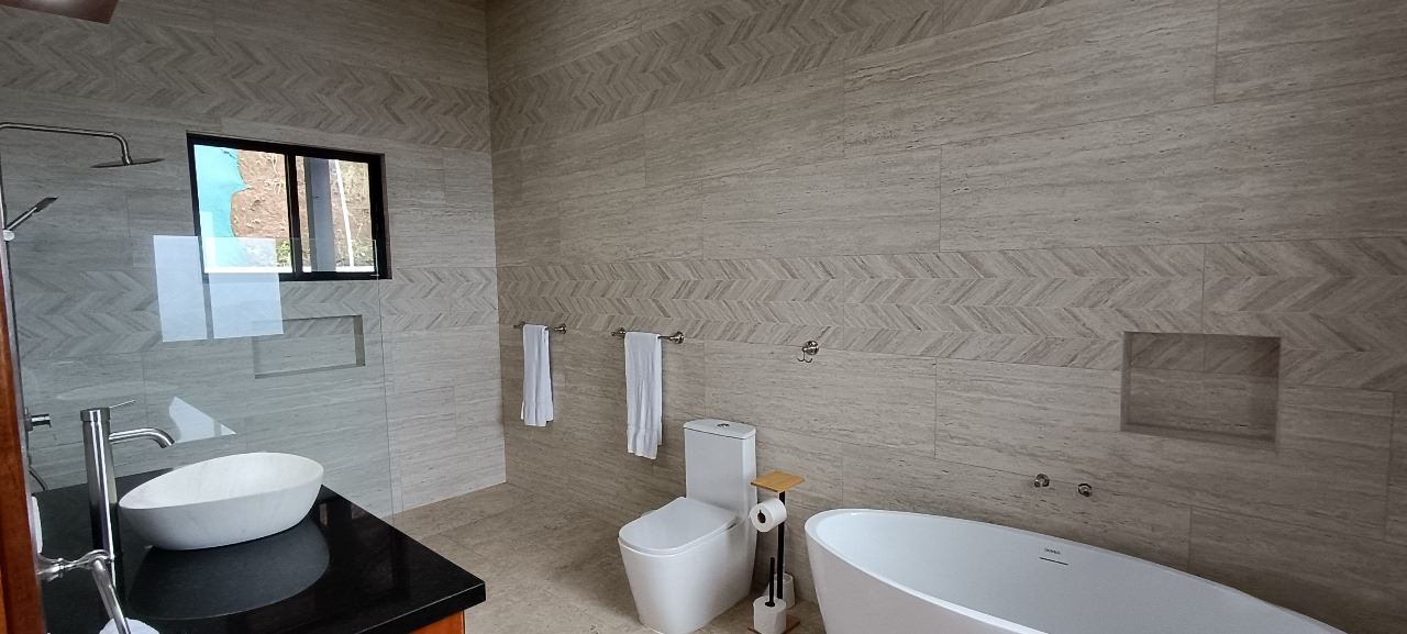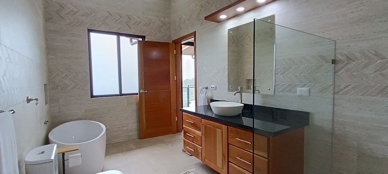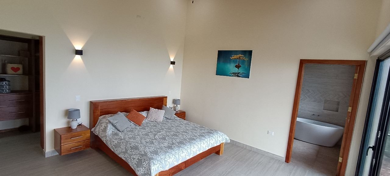 La suite principal cuenta con ducha y bañera independiente, con elegantes acabados modernos. Desde allí se accede a un amplio vestidor. Ambas áreas presentan elaborados trabajos en madera. La sala de estar también conecta con una habitación de invitados con baño privado y un aseo adicional con lavabo de pedestal. La casa cuenta con iluminación ambiental y ventiladores de techo.