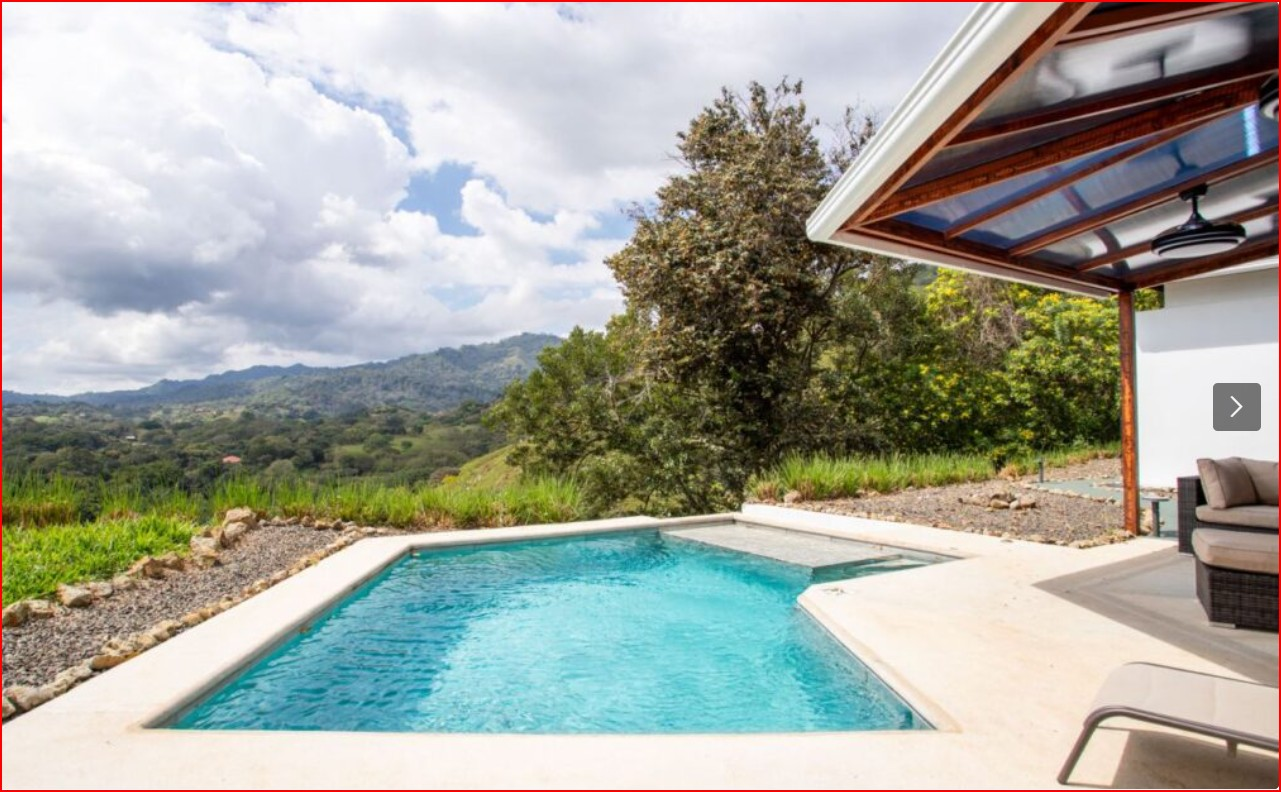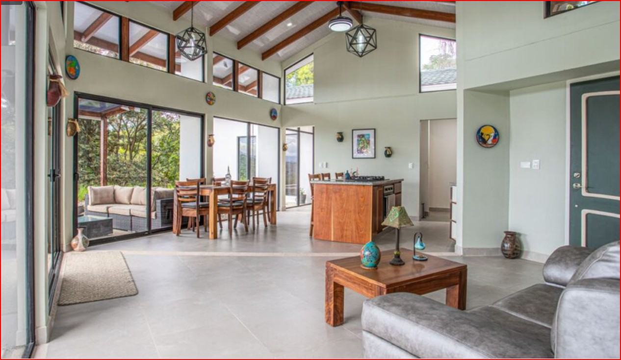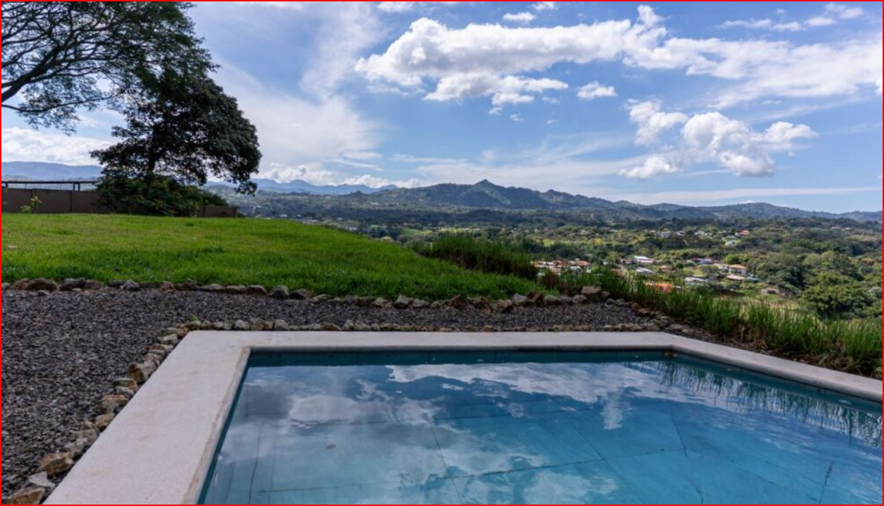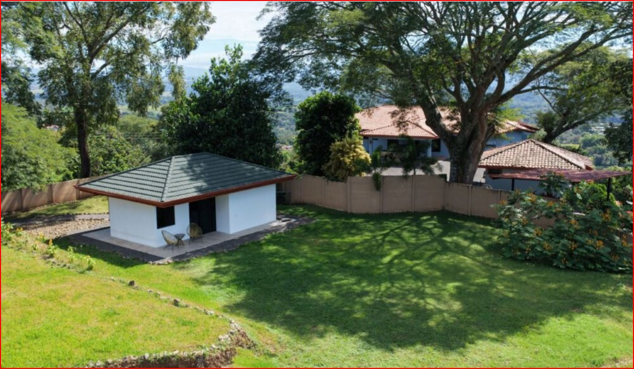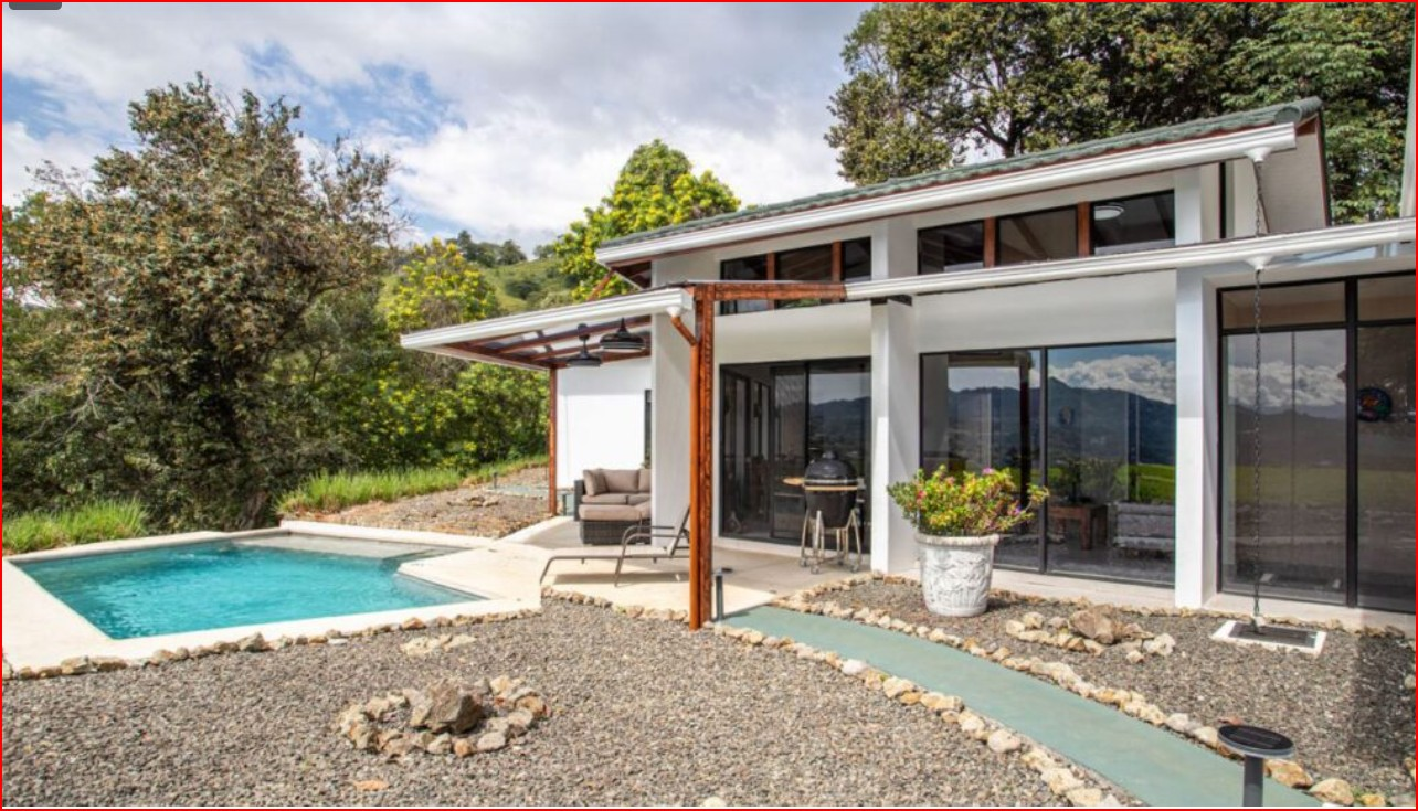 Modern designs can be found in this gated community in a natural setting in the Atenas countryside. This home is located in the private community of Cerro Luna in Barrio San Jose, about 12 minutes from town center. The property features 300 degree views towards the capital of San Jose, the area mountains and a good part of the small town of Atenas. The home’s layout features a common social open floor plan living and dinig room adjacent to a modern kitchen with artesenal woodwork throughout. This area leads to the inviting covered porch area and swimming pool. The master bedroom with ensuite bathroom can be found on one end of the home and two guest bedrooms on the opposite end with guest bathroom. The property is surrounded by nicely landscaped gardens and one also can find an independent guest studio on the opposite end of the lot with a kitchen-dining area and full bathroom.