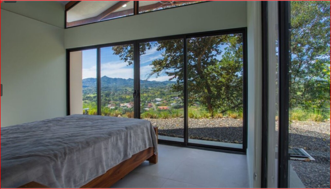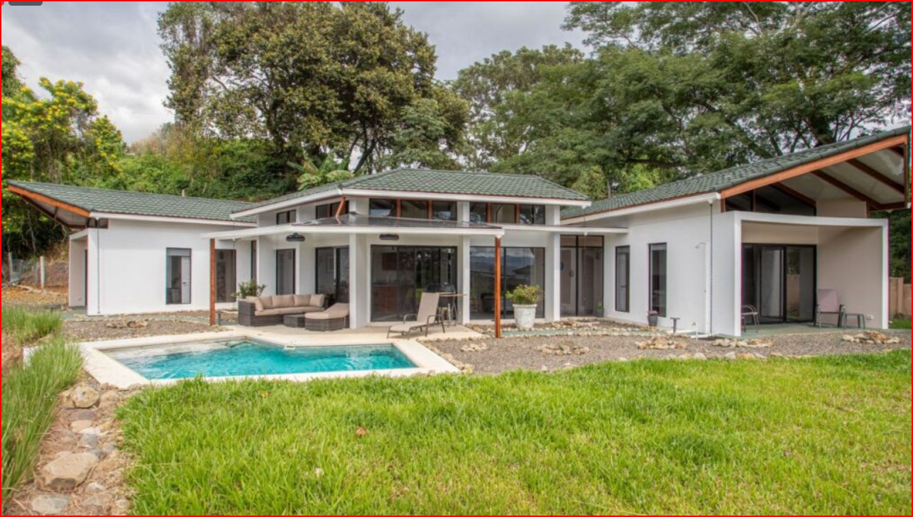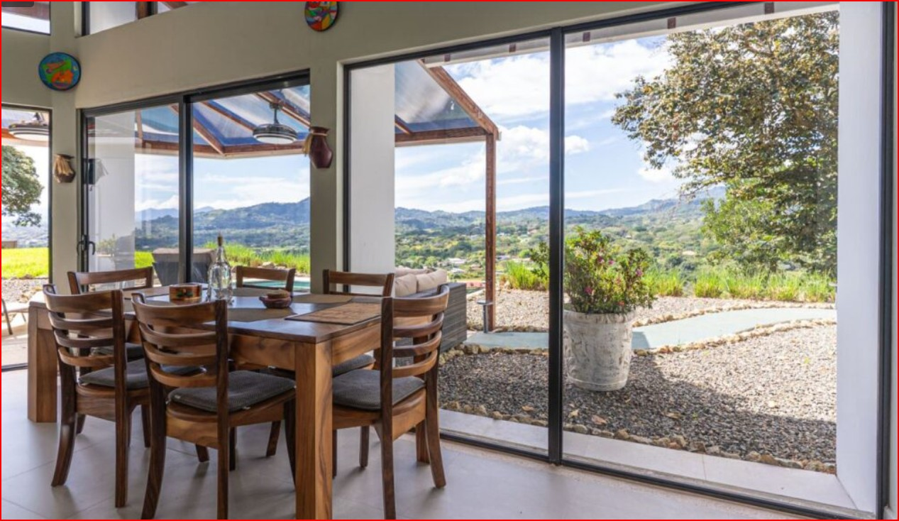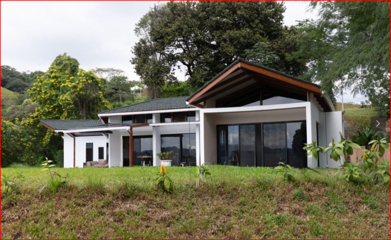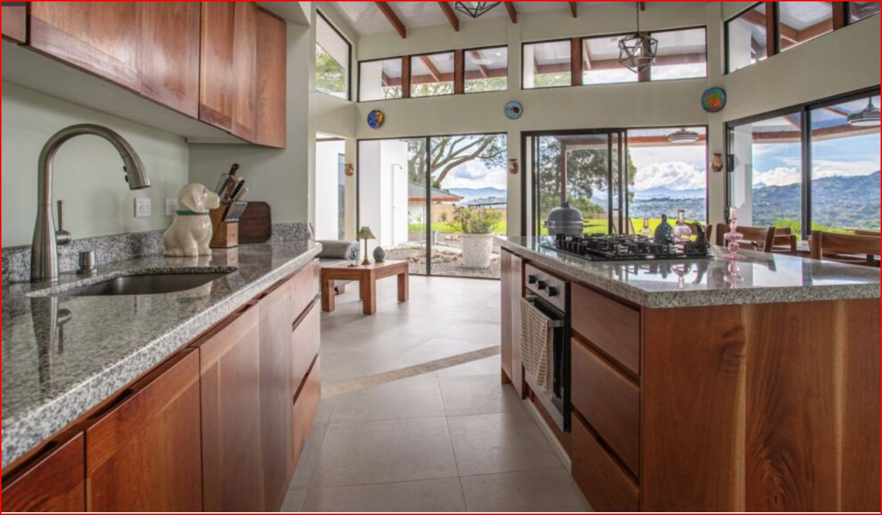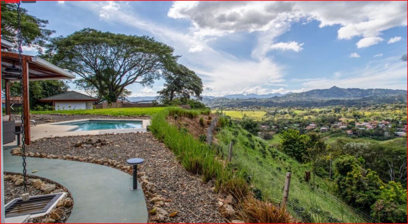 Modern designs can be found in this gated community in a natural setting in the Atenas countryside. This home is located in the private community of Cerro Luna in Barrio San Jose, about 12 minutes from town center. The property features 300 degree views towards the capital of San Jose, the area mountains and a good part of the small town of Atenas. The home’s layout features a common social open floor plan living and dinig room adjacent to a modern kitchen with artesenal woodwork throughout. This area leads to the inviting covered porch area and swimming pool. The master bedroom with ensuite bathroom can be found on one end of the home and two guest bedrooms on the opposite end with guest bathroom. The property is surrounded by nicely landscaped gardens and one also can find an independent guest studio on the opposite end of the lot with a kitchen-dining area and full bathroom.