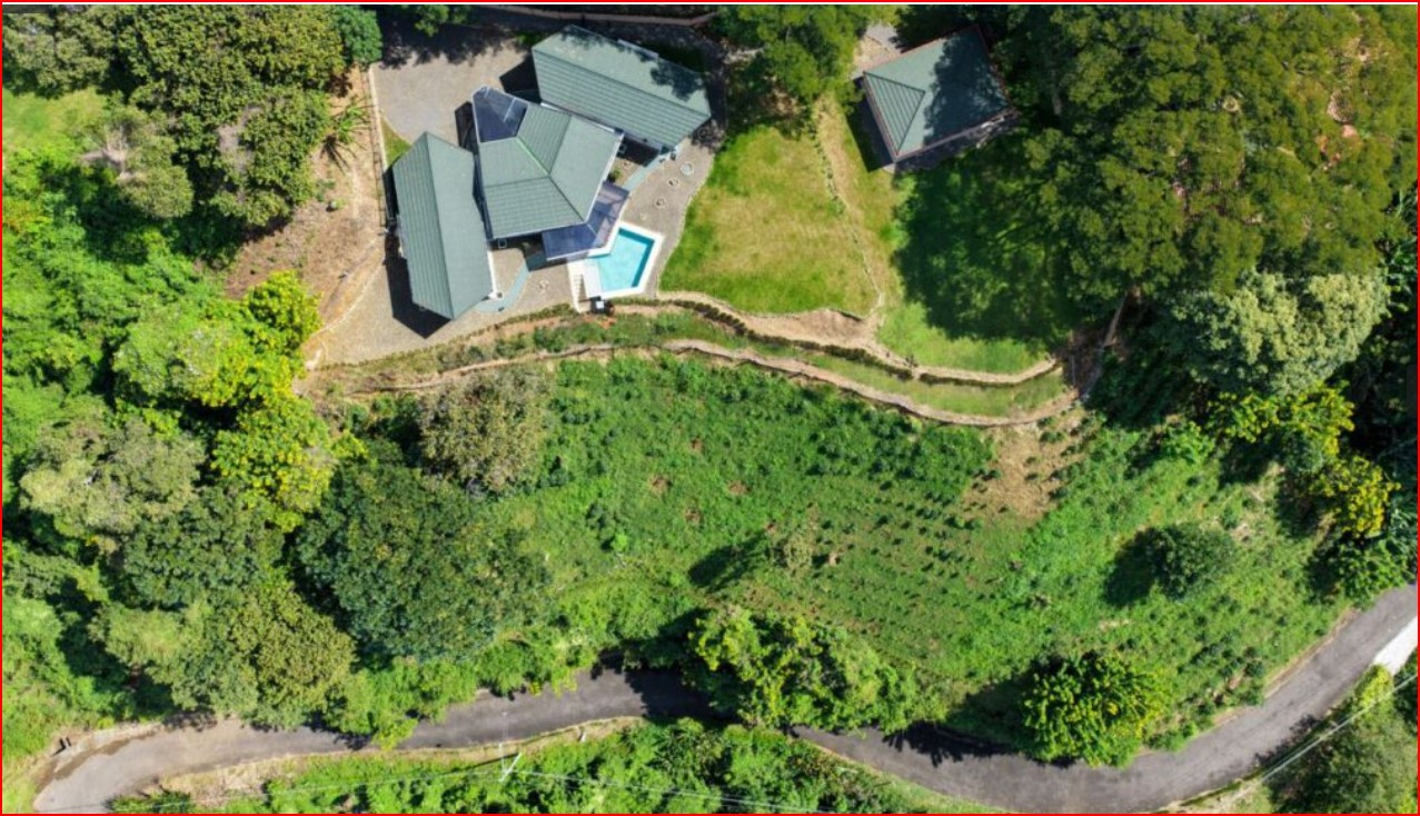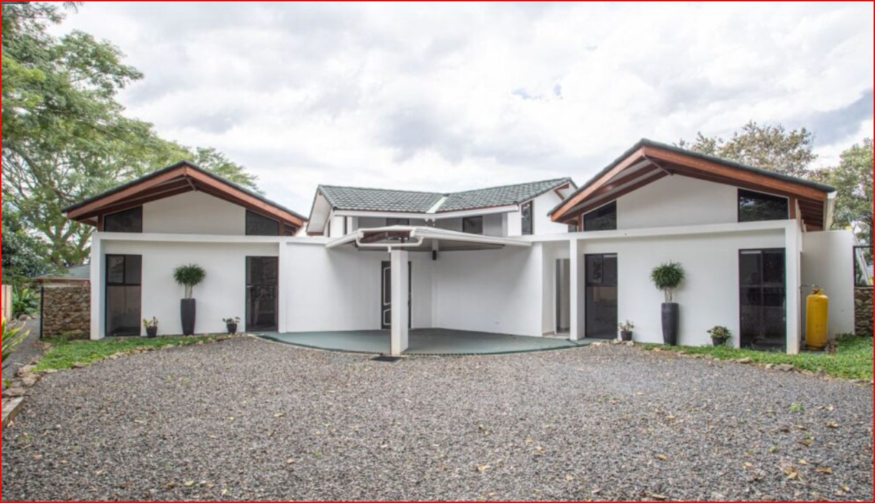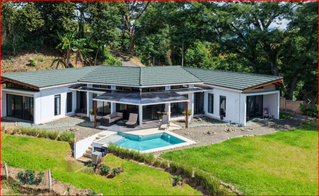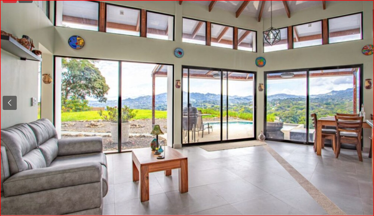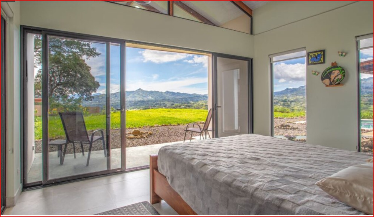 Modern designs can be found in this gated community in a natural setting in the Atenas countryside. This home is located in the private community of Cerro Luna in Barrio San Jose, about 12 minutes from town center. The property features 300 degree views towards the capital of San Jose, the area mountains and a good part of the small town of Atenas. The home’s layout features a common social open floor plan living and dinig room adjacent to a modern kitchen with artesenal woodwork throughout. This area leads to the inviting covered porch area and swimming pool. The master bedroom with ensuite bathroom can be found on one end of the home and two guest bedrooms on the opposite end with guest bathroom. The property is surrounded by nicely landscaped gardens and one also can find an independent guest studio on the opposite end of the lot with a kitchen-dining area and full bathroom.