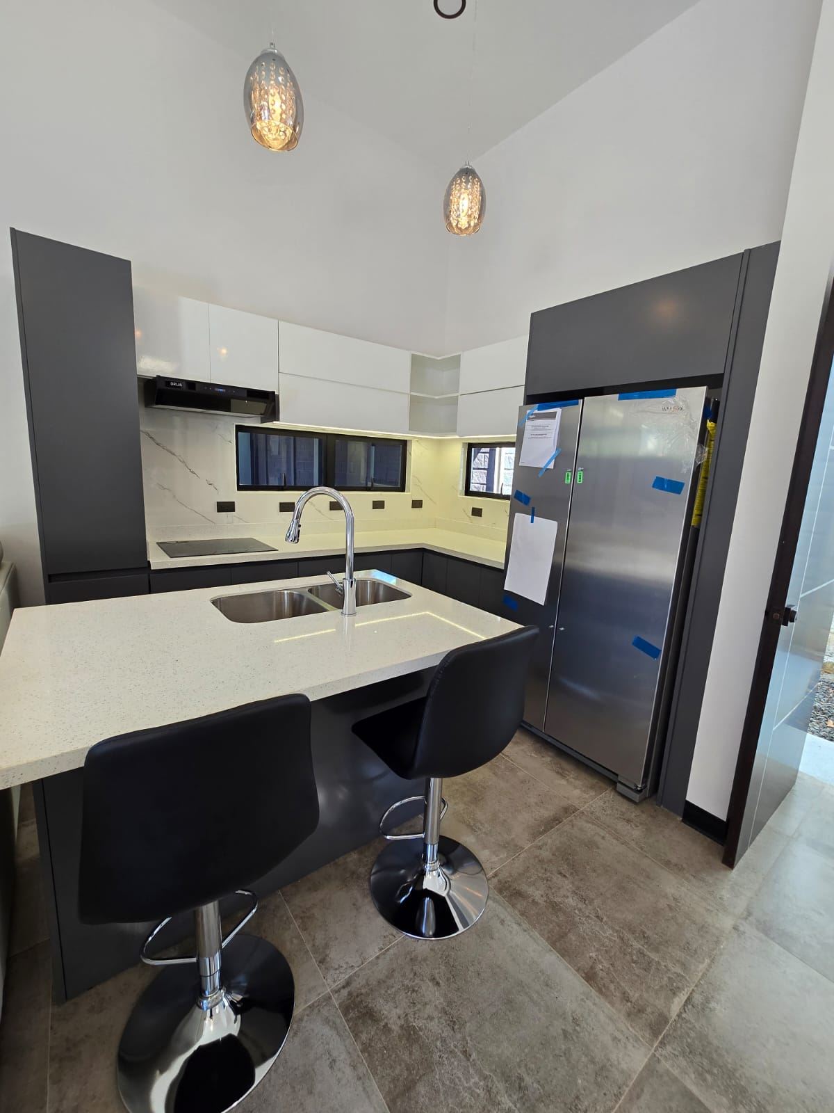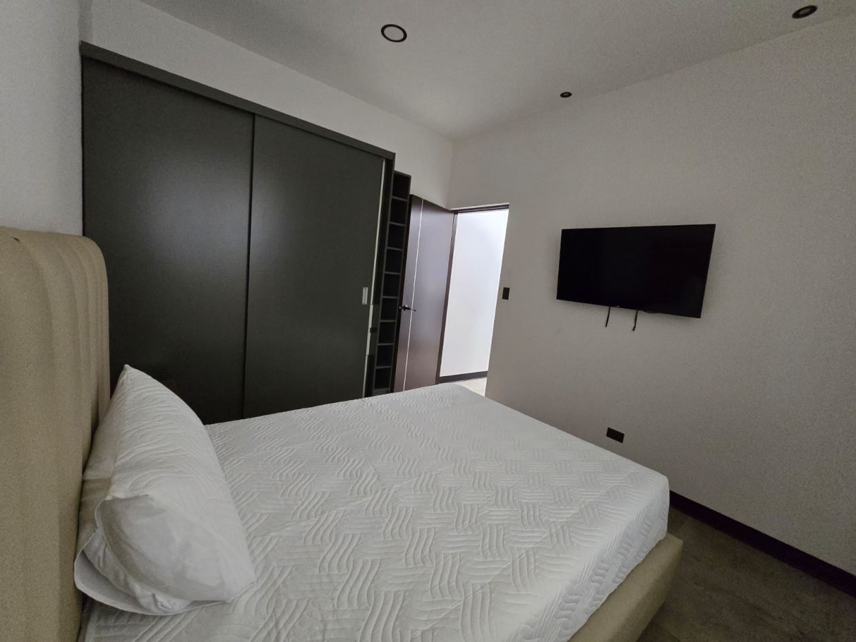 La casa está amueblada, cuenta con 2 camas Quin, torre de lavado, 2 TV, cocina, refrigeradora, muebles de sala, bancos de comedor, persianas.