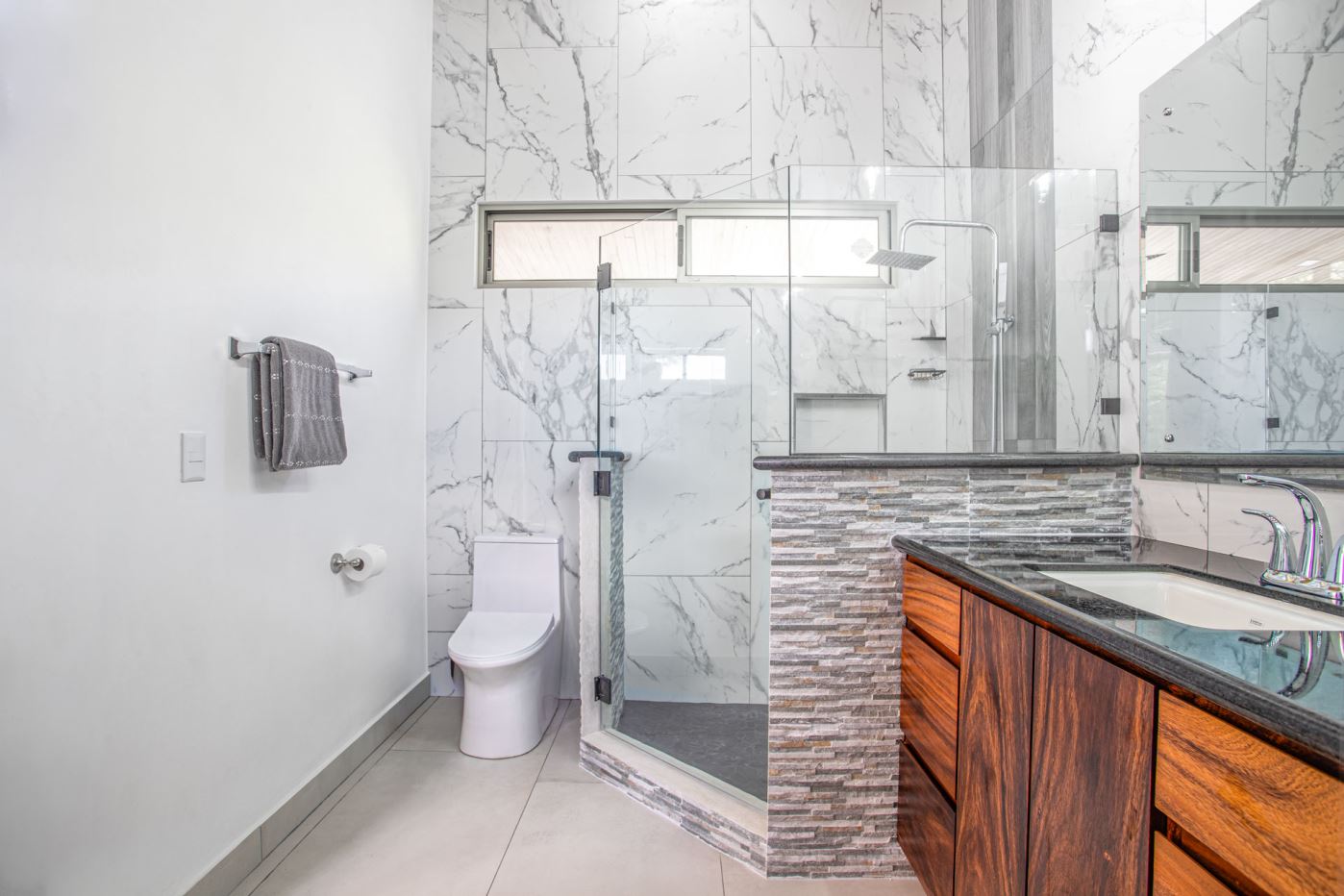 Una gran puerta batiente artesanal da paso a un espacioso plano abierto con techos de listones de madera artesanales y abundante luz desde la amplia y acogedora terraza cubierta. La espaciosa área común conduce a una cocina moderna y remodelada con isla y acabados modernos en todas partes. Hay electrodomésticos como nuevos y un lavadero/cuarto de servicio adyacente. Detrás de esta área hay dos habitaciones de invitados bien decoradas con un baño de invitados recientemente remodelado. En el extremo opuesto de la casa se encuentra la suite principal con baño en suite también remodelado. Este baño principal también da paso a la amplia terraza y la piscina. La casa cuenta con un hermoso jardín y se encuentra sobre un dosel forestal con vistas a las montañas de la zona. La terraza cuenta con un patio lateral que lleva a un nivel inferior donde se puede añadir un huerto, un cenador o cualquier proyecto adicional. Se podría construir un sendero que lleve hasta el arroyo al final de la propiedad. La ubicación es ideal para los observadores de aves, ya que se puede encontrar todo tipo de flora y fauna.