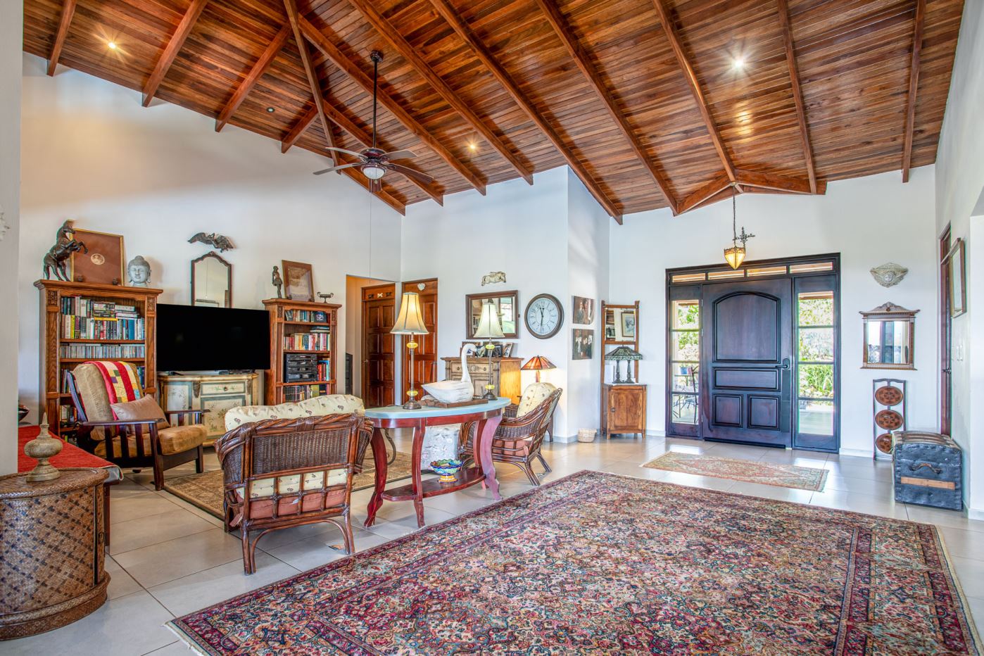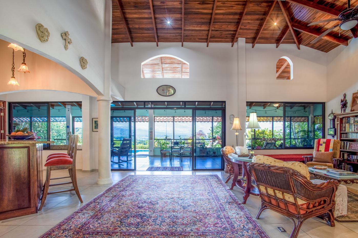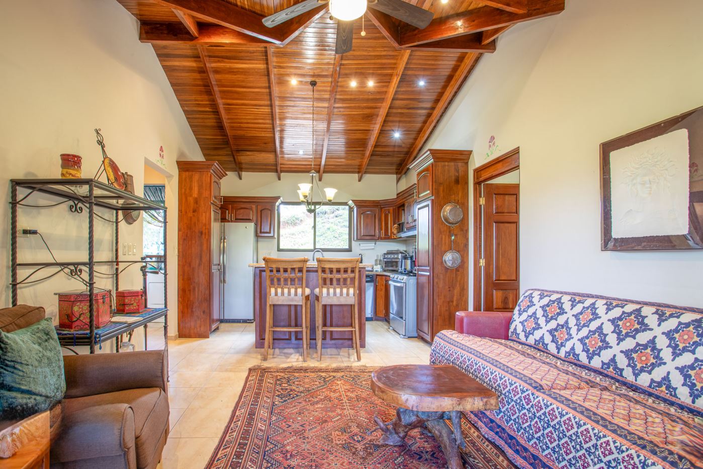 The main home features a large open floor plan with an ample kitchen ideal for chefs with plenty of room, an adjacent dining and spacious living room. This leads way to an extra large enclosed sun room perfect for those that want to enjoy the inside-outside feel of Atenas’ best climate. The home is finished with magestic artsenal woodwork throughout with wooden ceilings and beautiful craftsmanship in the kitchen, bathrooms and elsewhere. There is an enclosed garage. On the view side of the main home is a large inviting sun deck and nice size pool area.