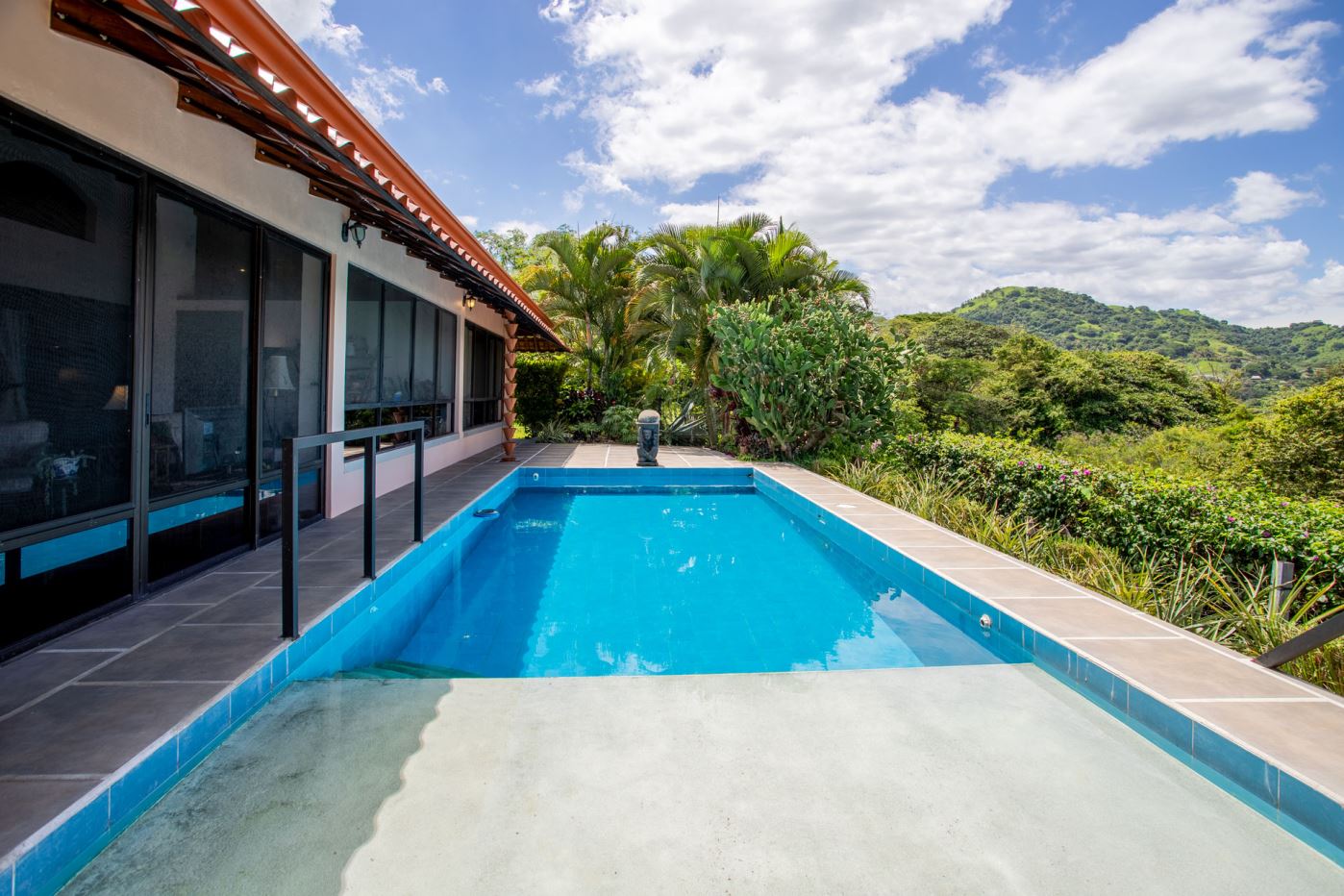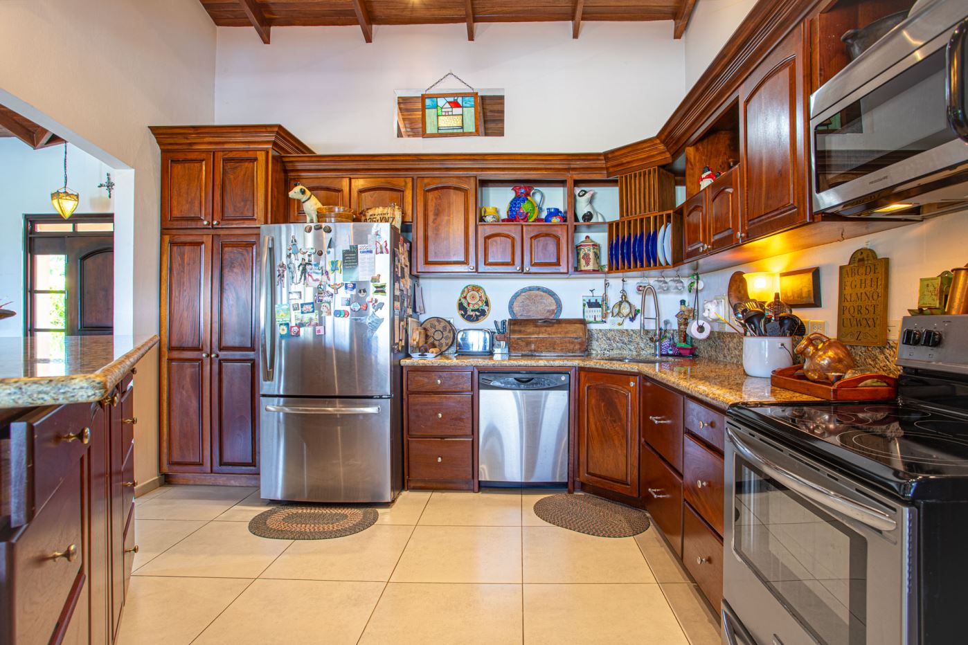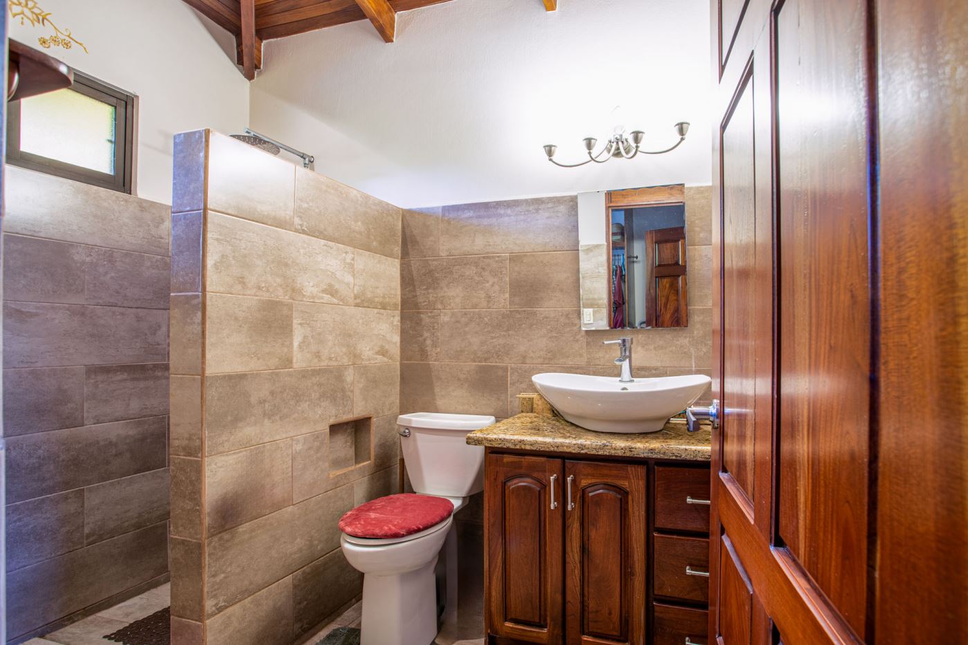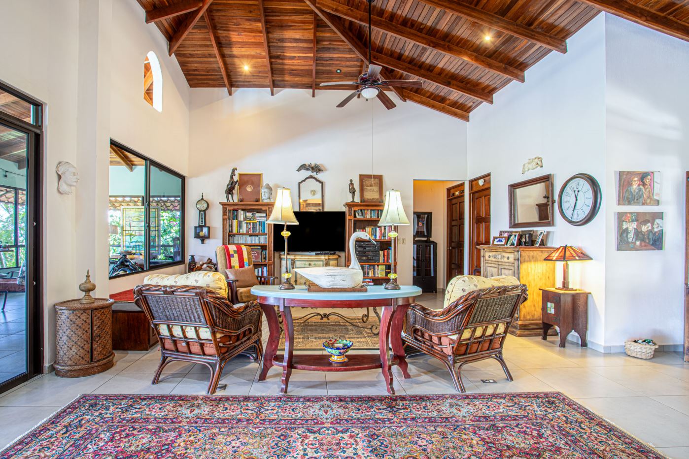 The main home features a large open floor plan with an ample kitchen ideal for chefs with plenty of room, an adjacent dining and spacious living room. This leads way to an extra large enclosed sun room perfect for those that want to enjoy the inside-outside feel of Atenas’ best climate. The home is finished with magestic artsenal woodwork throughout with wooden ceilings and beautiful craftsmanship in the kitchen, bathrooms and elsewhere. There is an enclosed garage. On the view side of the main home is a large inviting sun deck and nice size pool area.
