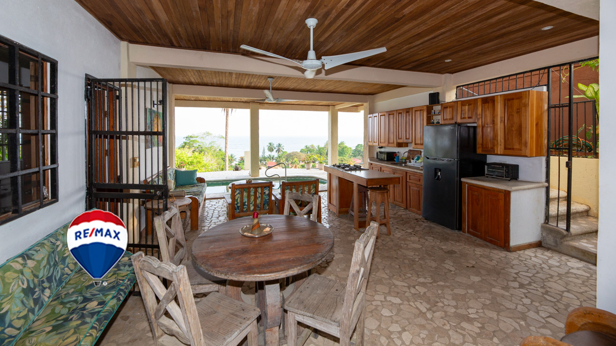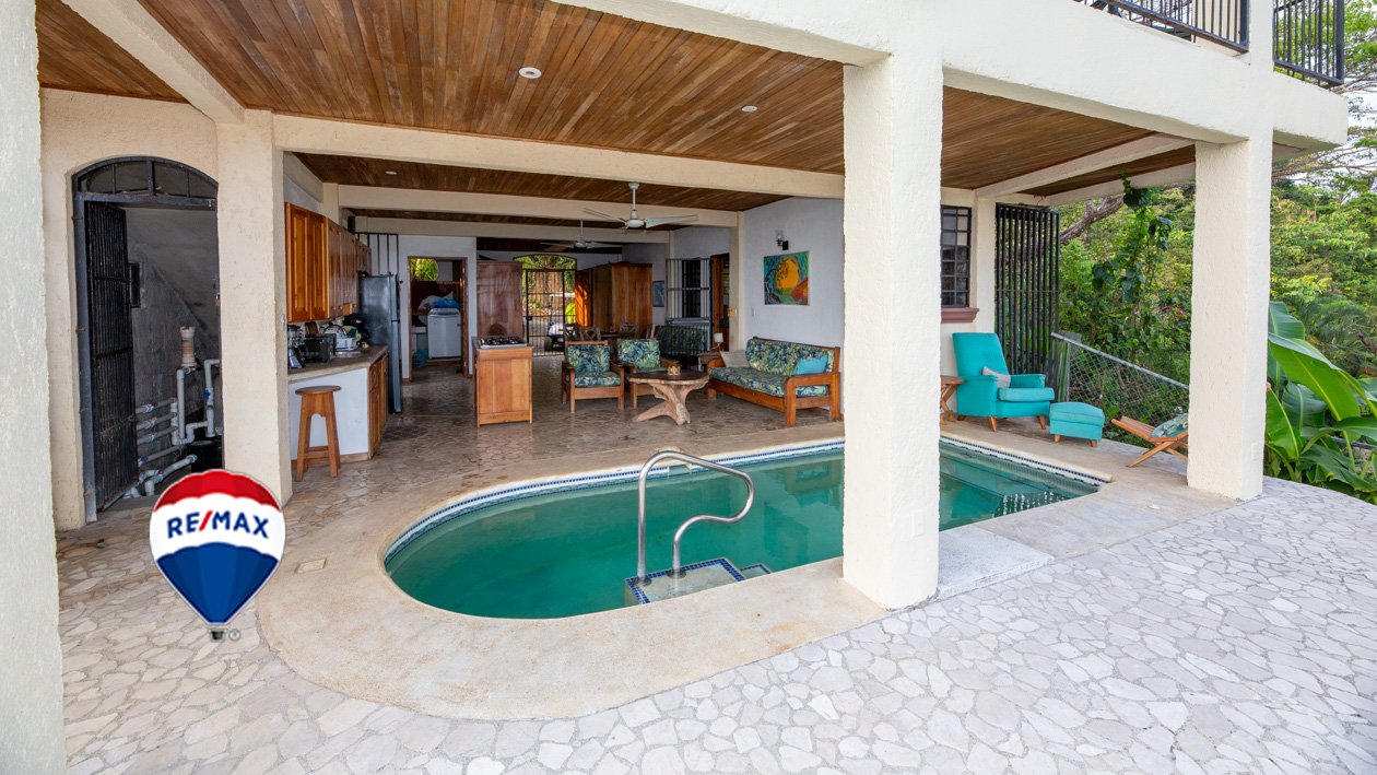 Downstairs there is an air conditioned bedroom with private bathroom, an additional guest bathroom that doubles as a laundry room and a kitchen. The living space is left open aired to catch the daily ocean breezes which looks over the plunge pool with jacuzzi jets and panoramic ocean views.