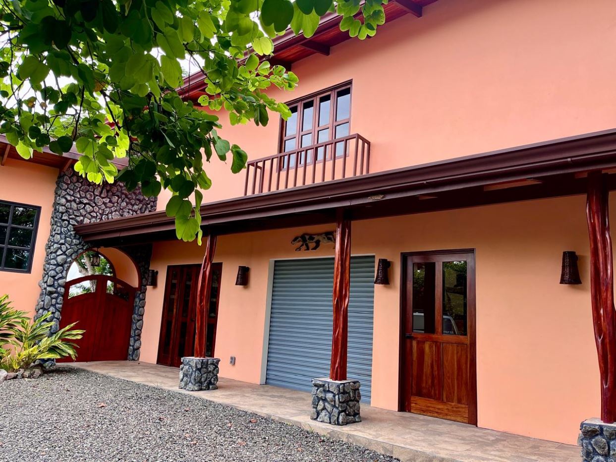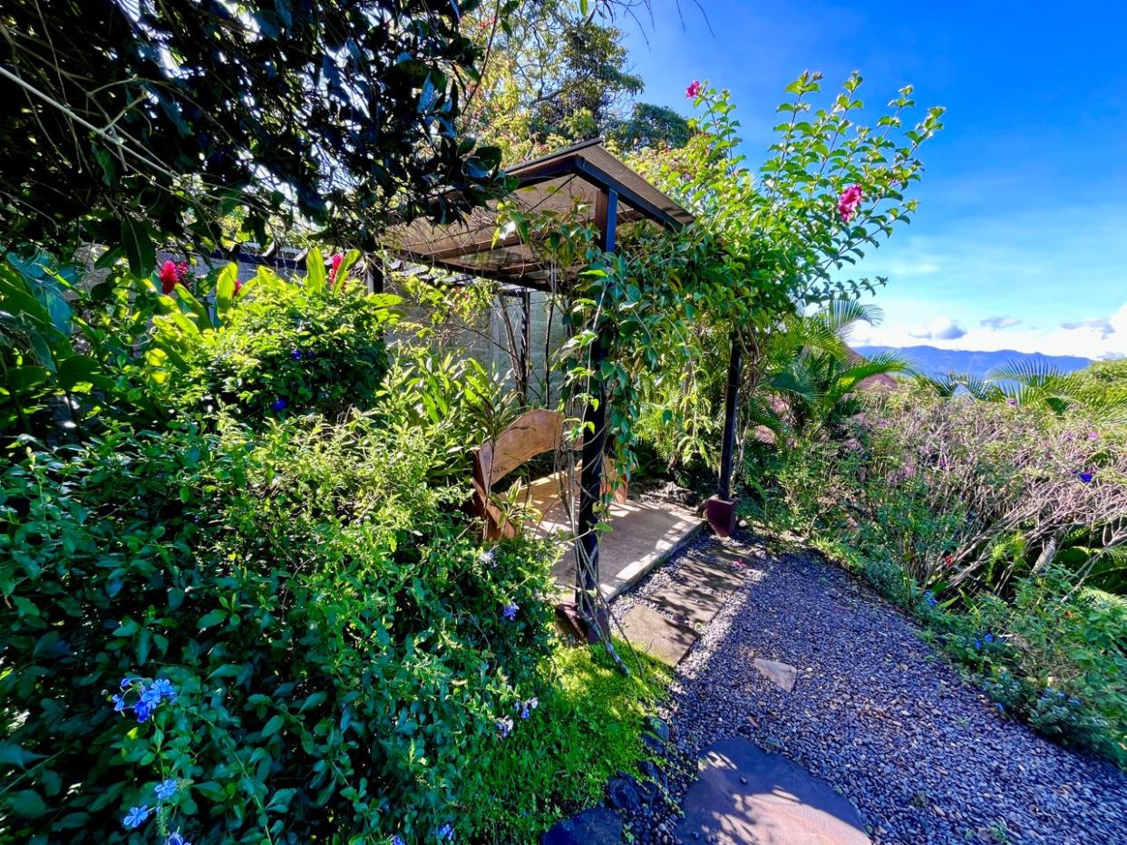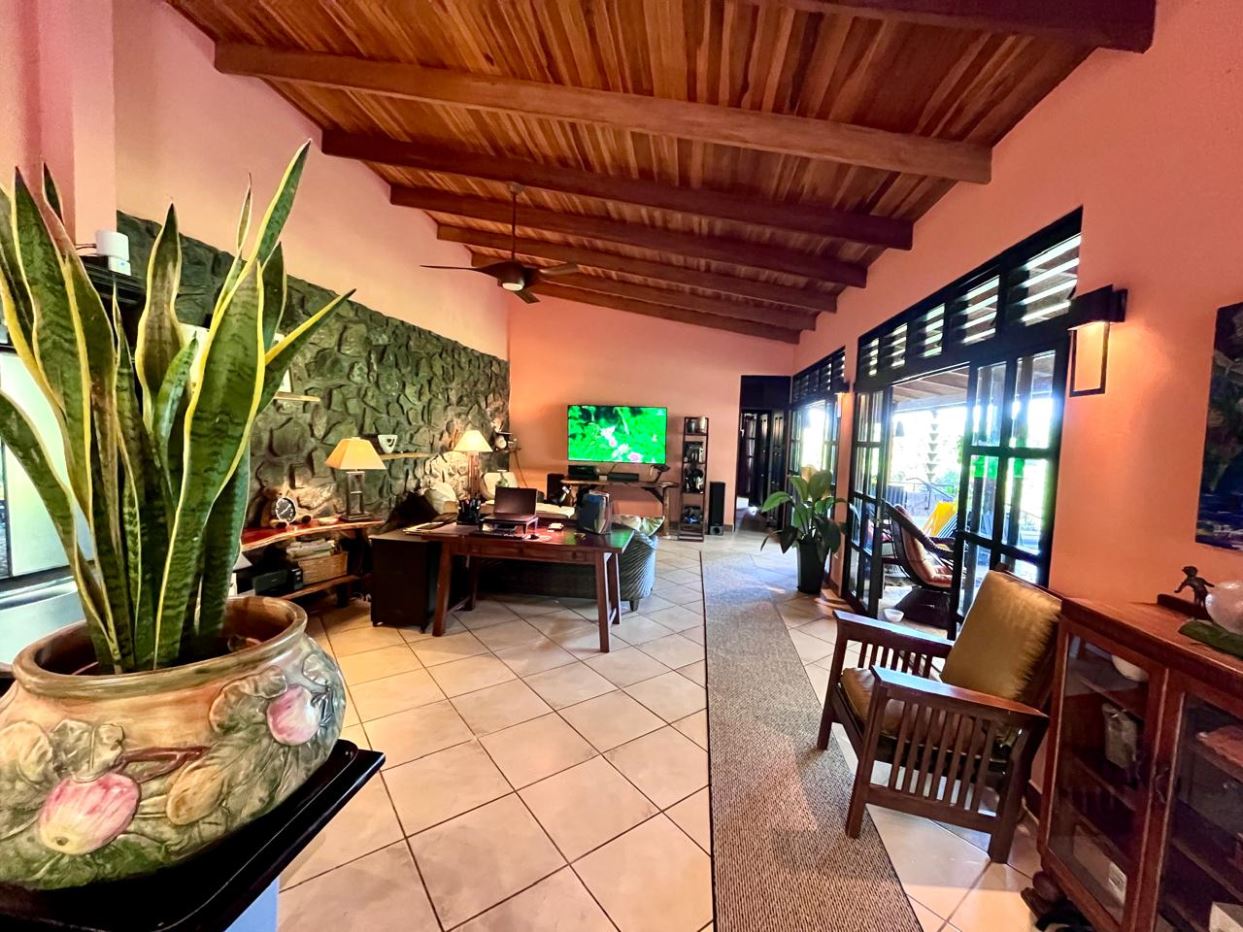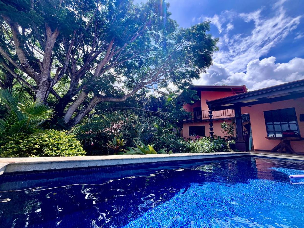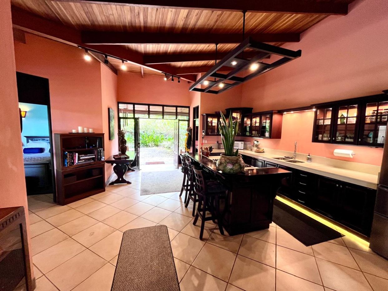 Unique Picaflora home and guest home in one of town’s most exclusive communities. Located just 5 minutes from town center the home sits in a countryside setting adjacent a primary forest with panoramic views of the area mountains and the scenary is full of flora and fauna. The automatic gates opens to a large parking area that leads one to the main home, the formal entry displays the open floor plan with beautiful rock and woodwork throughout. There is an ample remodeled kitchen and sliding doors that lead to the inviting courtyard and pool area. There is a half bathroom near the formal entry and a hallway leads to the guest bedroom suite and further inside is the master bedroom suite and large pantry and laundry areas.