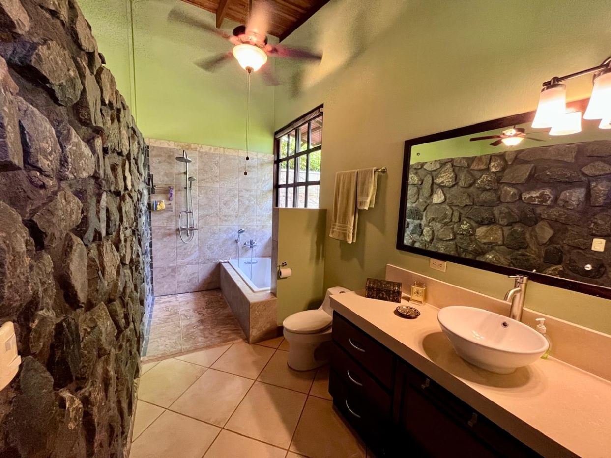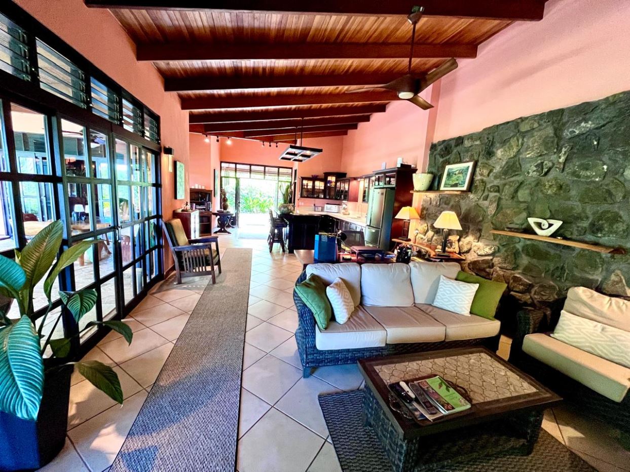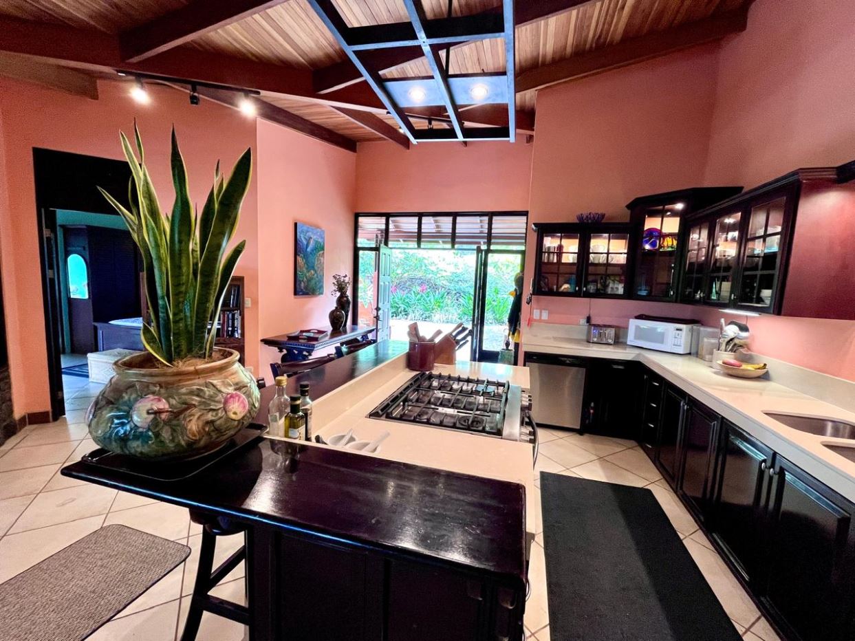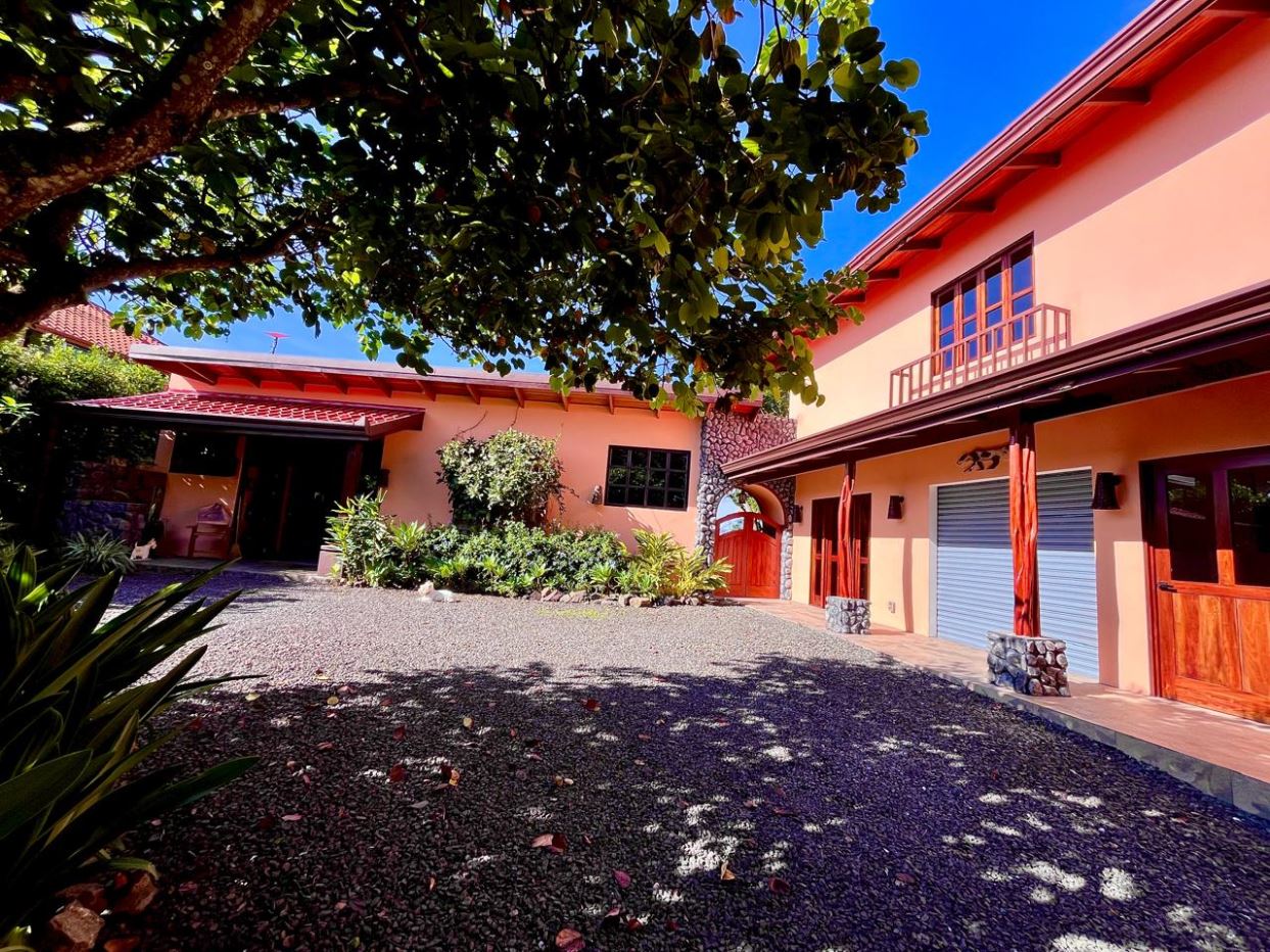 Unique Picaflora home and guest home in one of town’s most exclusive communities. Located just 5 minutes from town center the home sits in a countryside setting adjacent a primary forest with panoramic views of the area mountains and the scenary is full of flora and fauna. The automatic gates opens to a large parking area that leads one to the main home, the formal entry displays the open floor plan with beautiful rock and woodwork throughout. There is an ample remodeled kitchen and sliding doors that lead to the inviting courtyard and pool area. There is a half bathroom near the formal entry and a hallway leads to the guest bedroom suite and further inside is the master bedroom suite and large pantry and laundry areas.