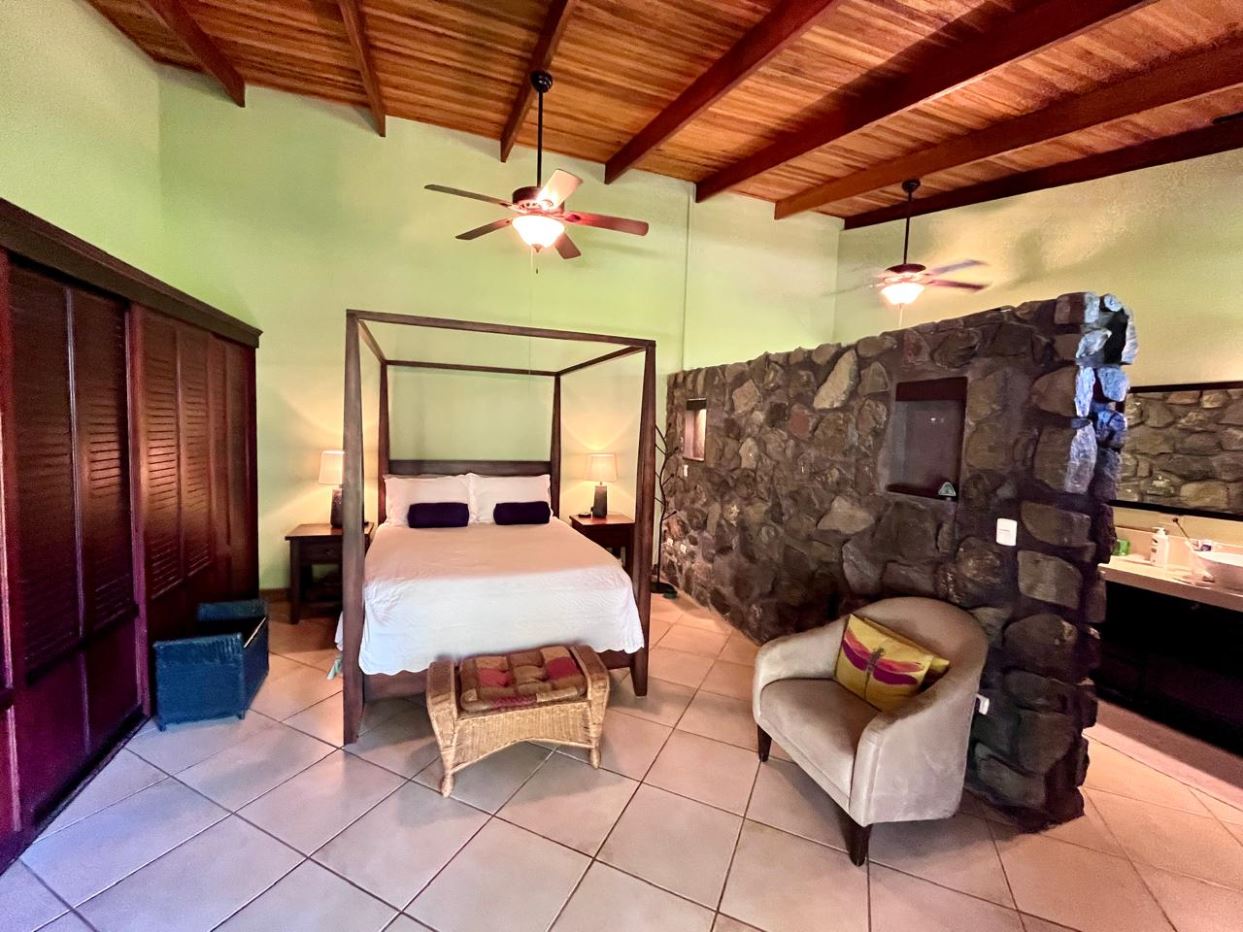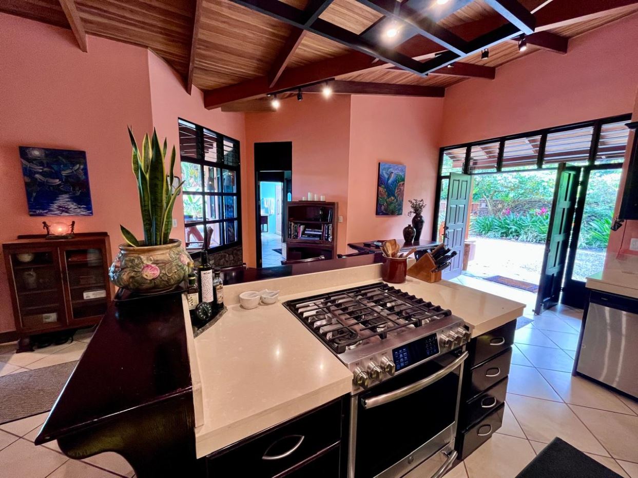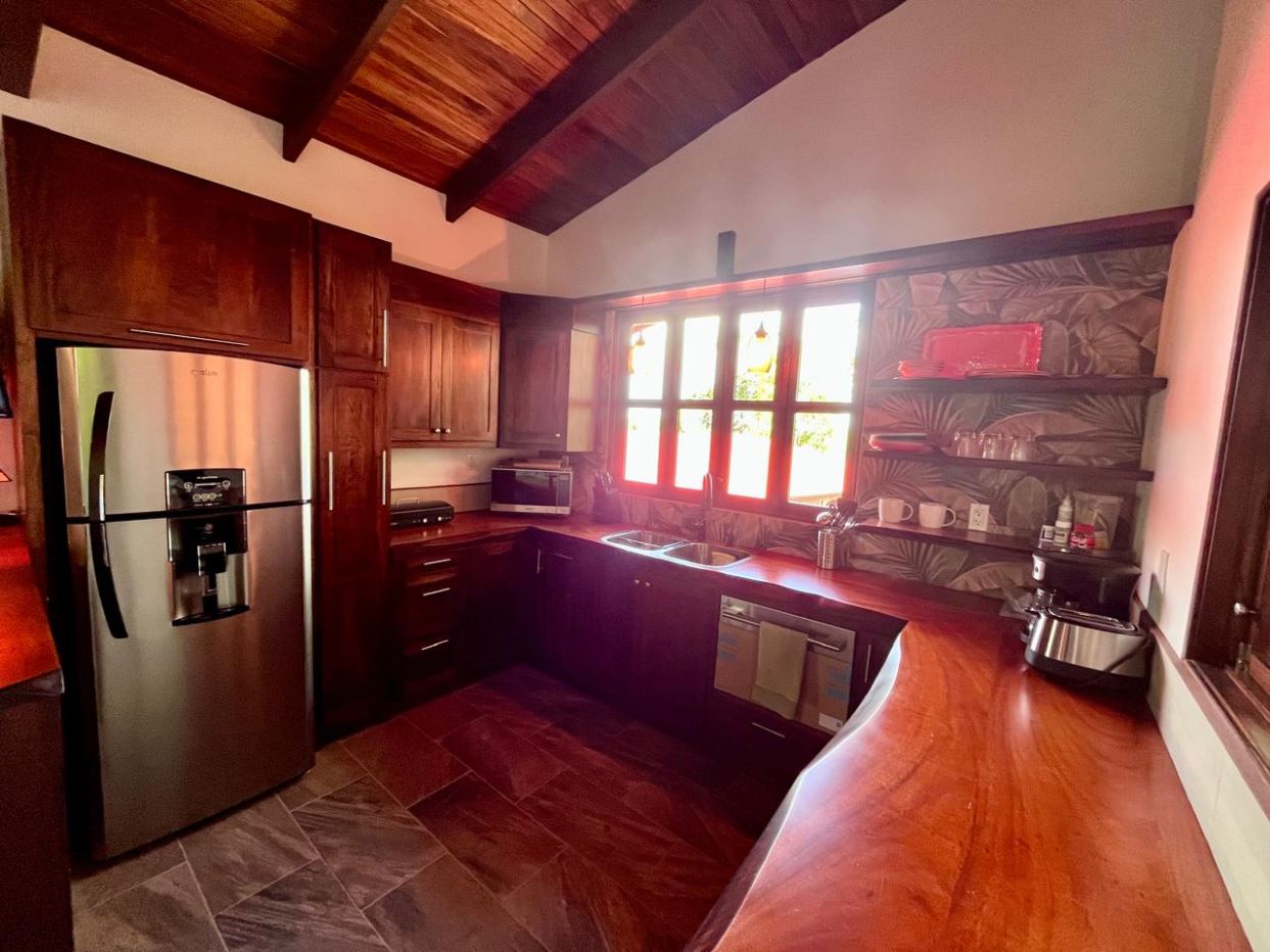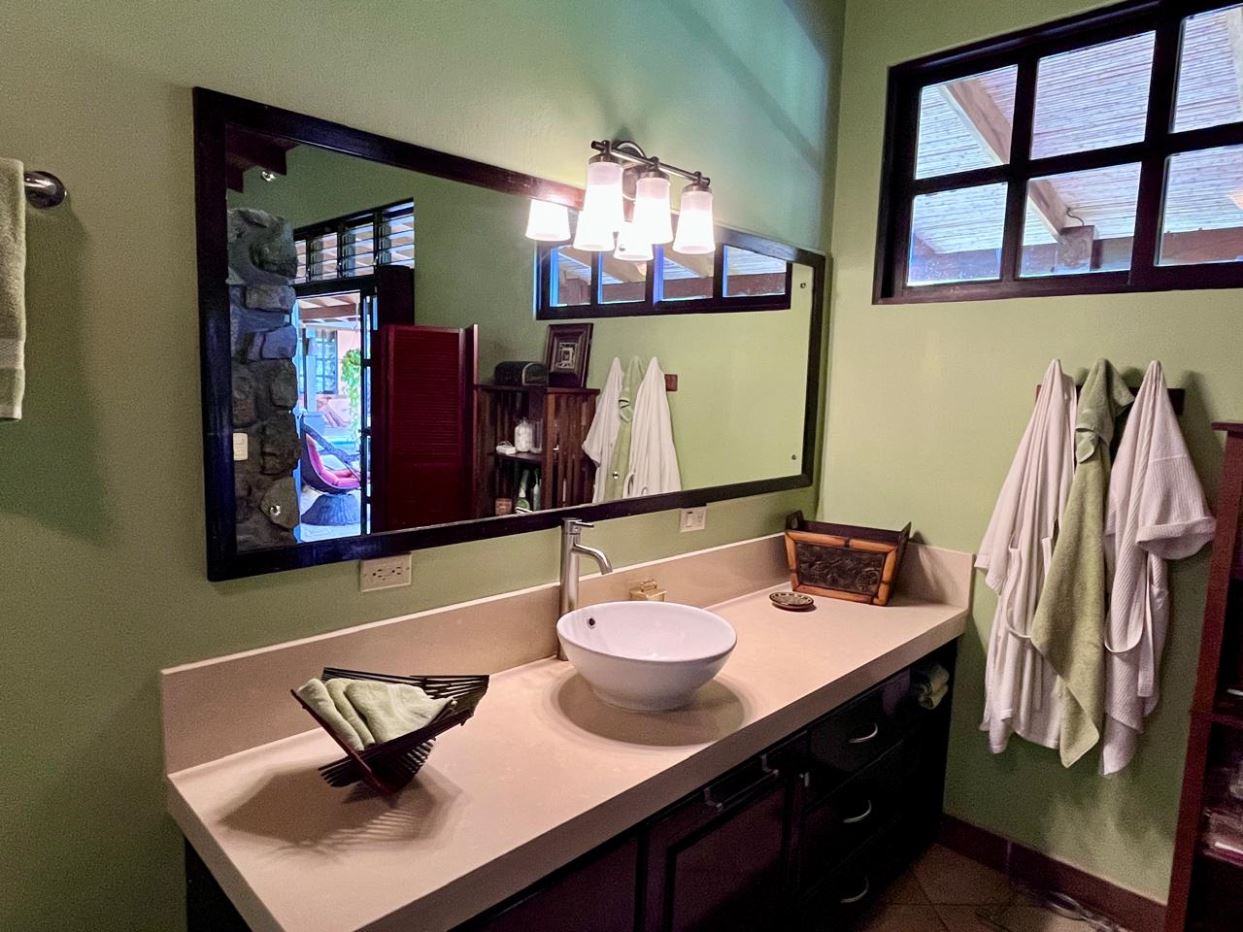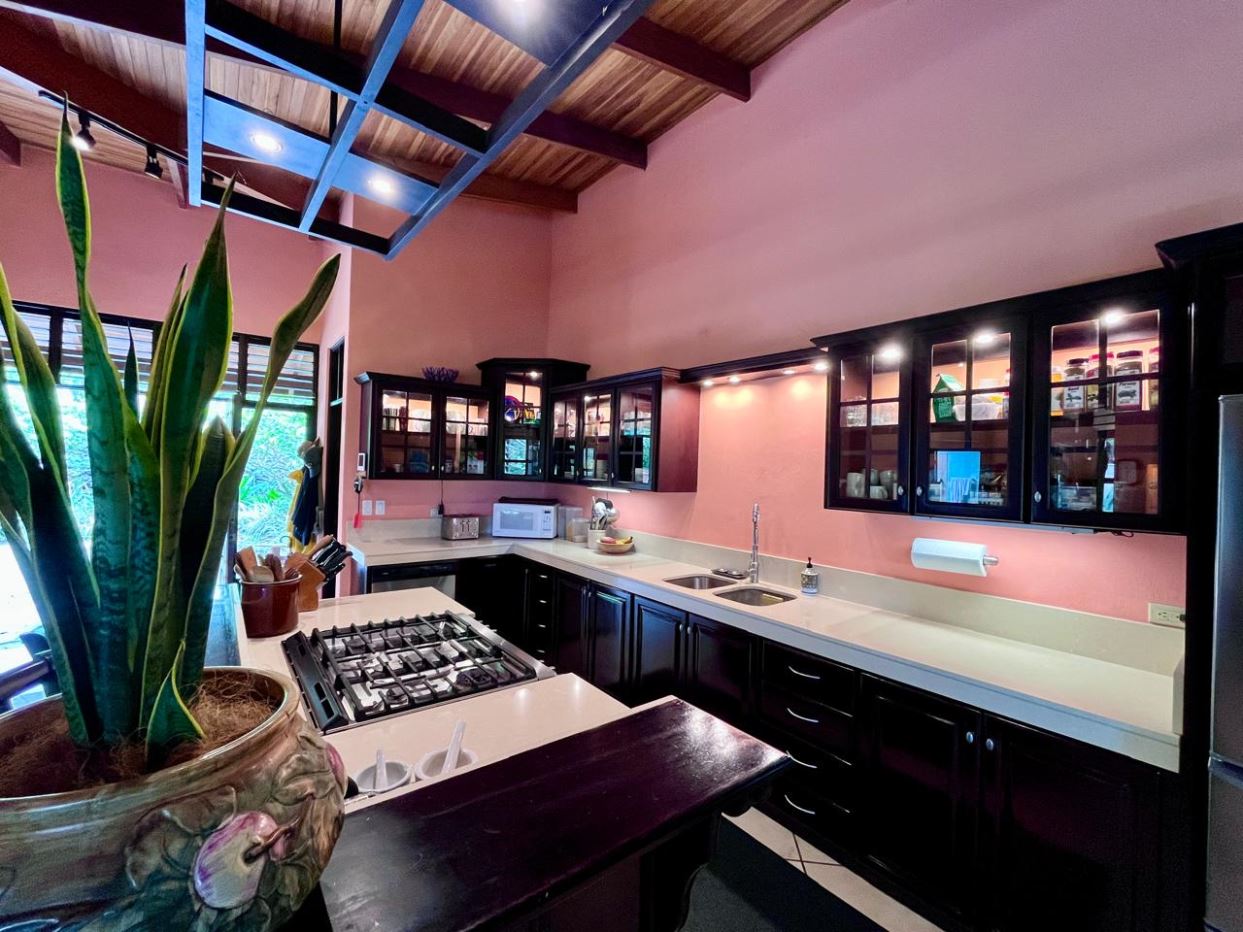 Unique Picaflora home and guest home in one of town’s most exclusive communities. Located just 5 minutes from town center the home sits in a countryside setting adjacent a primary forest with panoramic views of the area mountains and the scenary is full of flora and fauna. The automatic gates opens to a large parking area that leads one to the main home, the formal entry displays the open floor plan with beautiful rock and woodwork throughout. There is an ample remodeled kitchen and sliding doors that lead to the inviting courtyard and pool area. There is a half bathroom near the formal entry and a hallway leads to the guest bedroom suite and further inside is the master bedroom suite and large pantry and laundry areas.