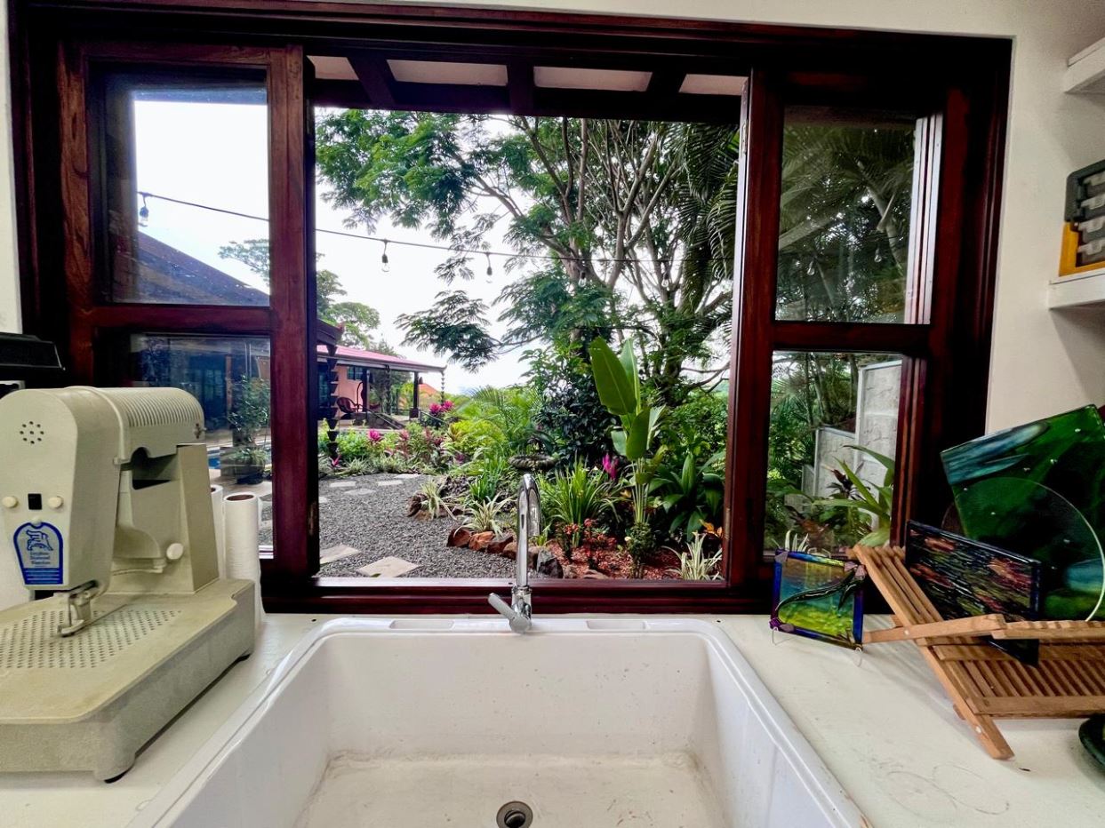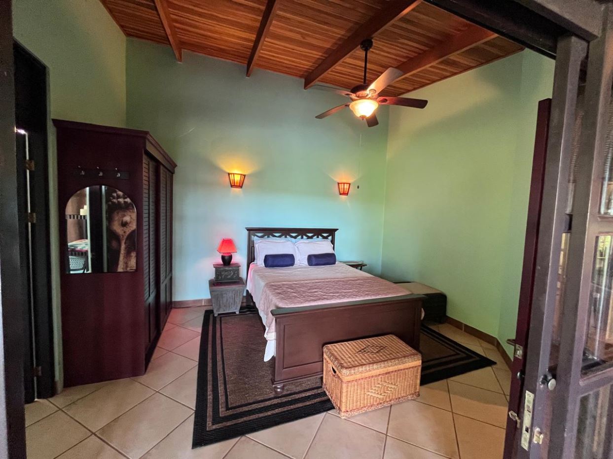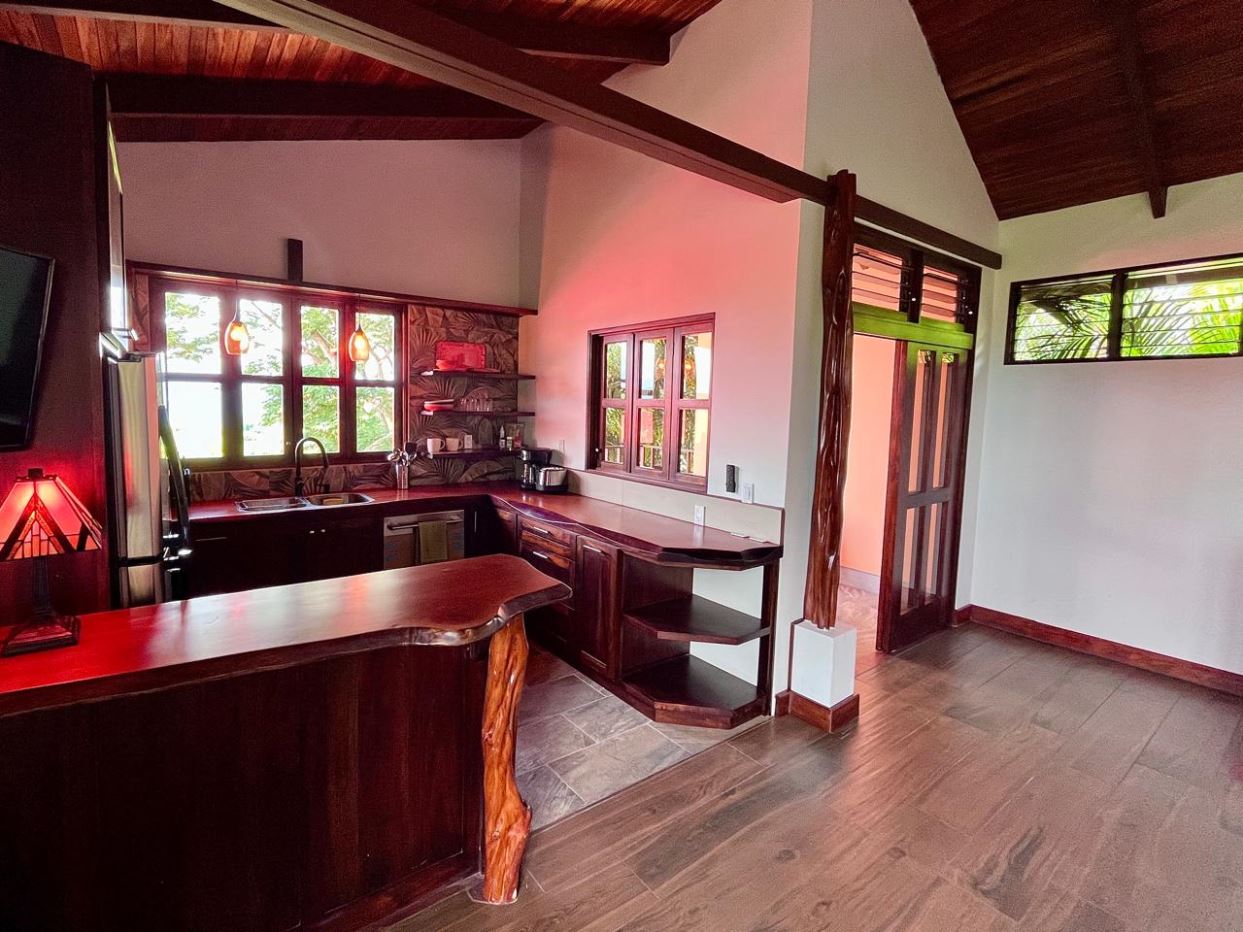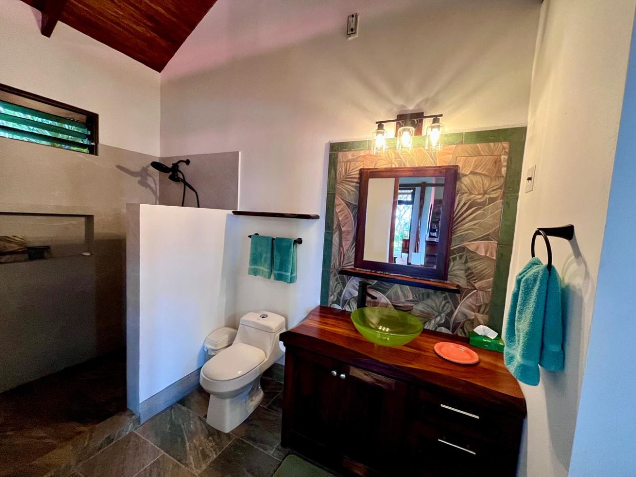 Unique Picaflora home and guest home in one of town’s most exclusive communities. Located just 5 minutes from town center the home sits in a countryside setting adjacent a primary forest with panoramic views of the area mountains and the scenary is full of flora and fauna. The automatic gates opens to a large parking area that leads one to the main home, the formal entry displays the open floor plan with beautiful rock and woodwork throughout. There is an ample remodeled kitchen and sliding doors that lead to the inviting courtyard and pool area. There is a half bathroom near the formal entry and a hallway leads to the guest bedroom suite and further inside is the master bedroom suite and large pantry and laundry areas.