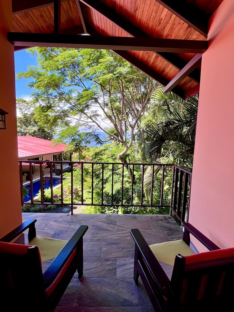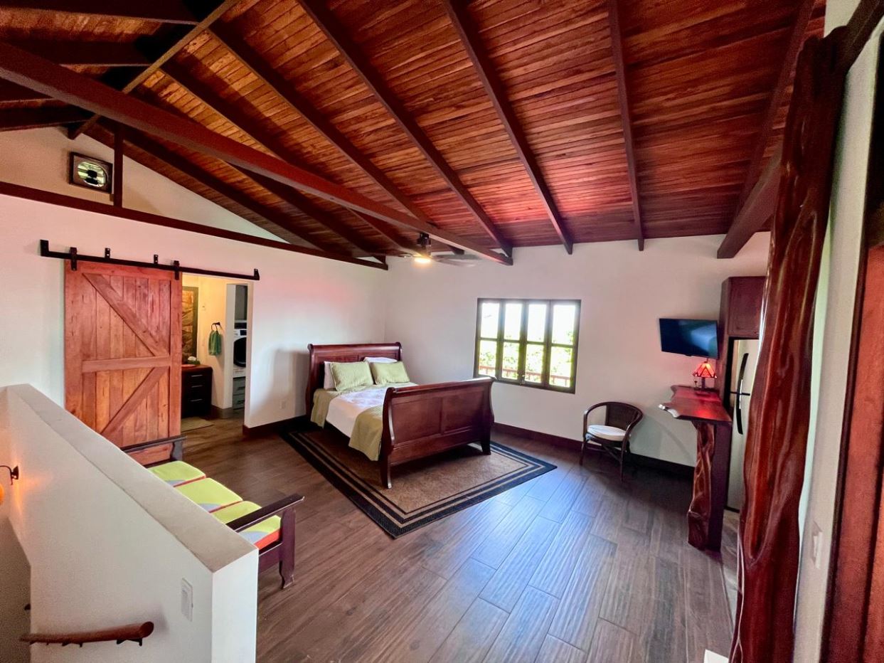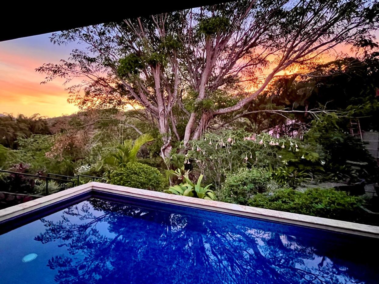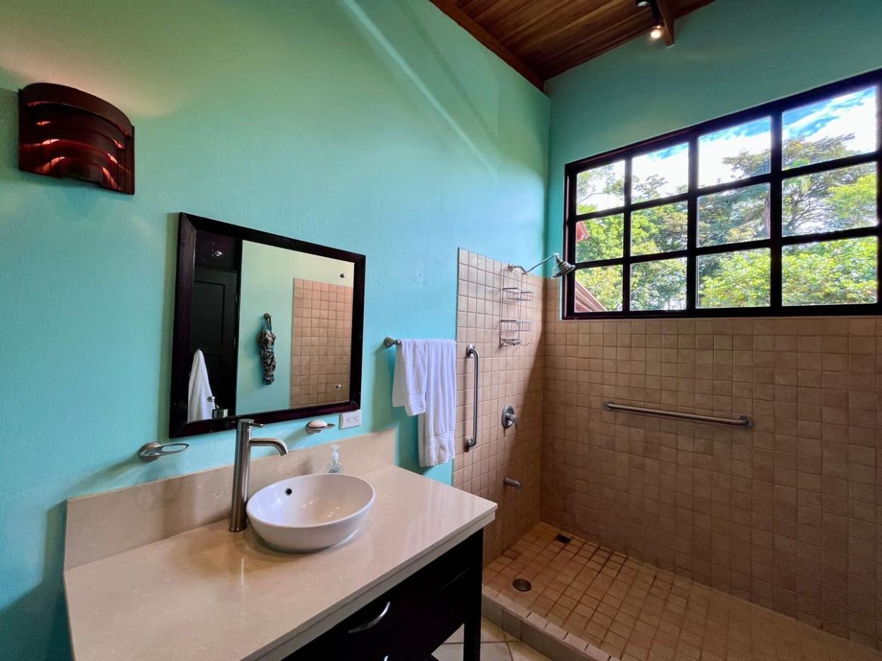 Unique Picaflora home and guest home in one of town’s most exclusive communities. Located just 5 minutes from town center the home sits in a countryside setting adjacent a primary forest with panoramic views of the area mountains and the scenary is full of flora and fauna. The automatic gates opens to a large parking area that leads one to the main home, the formal entry displays the open floor plan with beautiful rock and woodwork throughout. There is an ample remodeled kitchen and sliding doors that lead to the inviting courtyard and pool area. There is a half bathroom near the formal entry and a hallway leads to the guest bedroom suite and further inside is the master bedroom suite and large pantry and laundry areas.