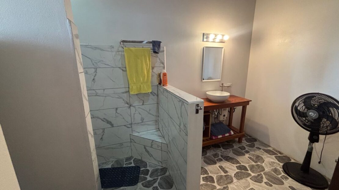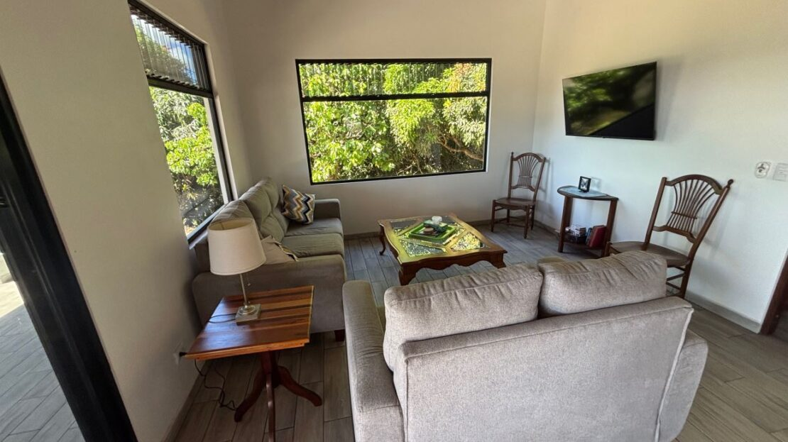 The sliding glass doors in the living room lead to the inviting covered porch, saltwater pool, and terrace area. Adjacent are several mango trees along with an orchard composed of mangoes, oranges, limes, coconuts, bananas, plantains, water apples, papayas, guavas, avocados, other types of citrus fruits, and pitahaya.