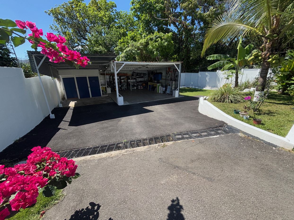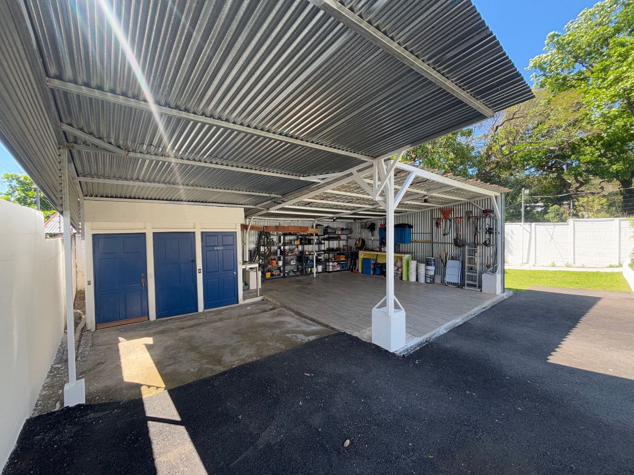 Al final de la entrada pavimentada y bordeada de palmeras, se encuentra una bodega con capacidad para 3 vehículos y que puede usarse como garaje.
